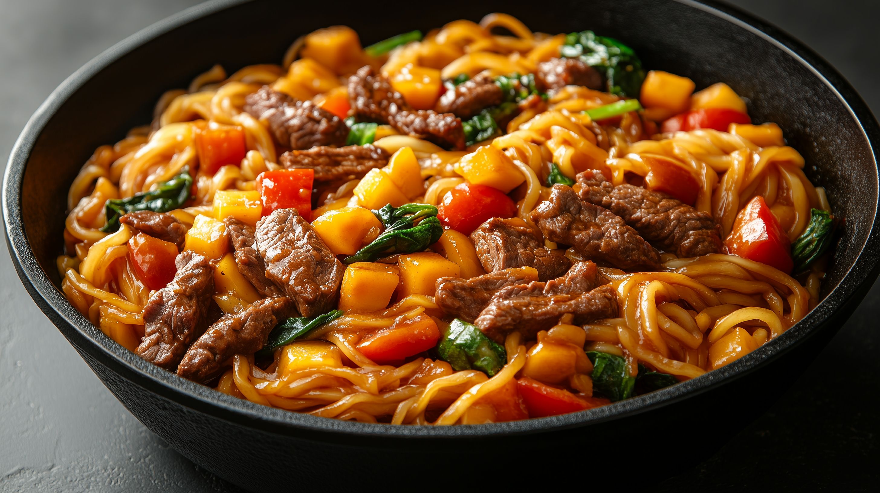 Dieses appetitliche Foto zeigt einen Wok-Teller mit würzigen, gebratenen Rindfleisch-Nudeln und frischem Gemüse. Die Optik ist natürlich und rustikal, mit kräftigen Farben und Textur. Das Gericht ist ideal für asiatische Gerichte, Foodblogs oder Werbung für Fertiggerichte und Kochzutaten. Das hochwertige Stockfoto ist in hoher Auflösung und unter einer Creative Commons-Lizenz verfügbar.