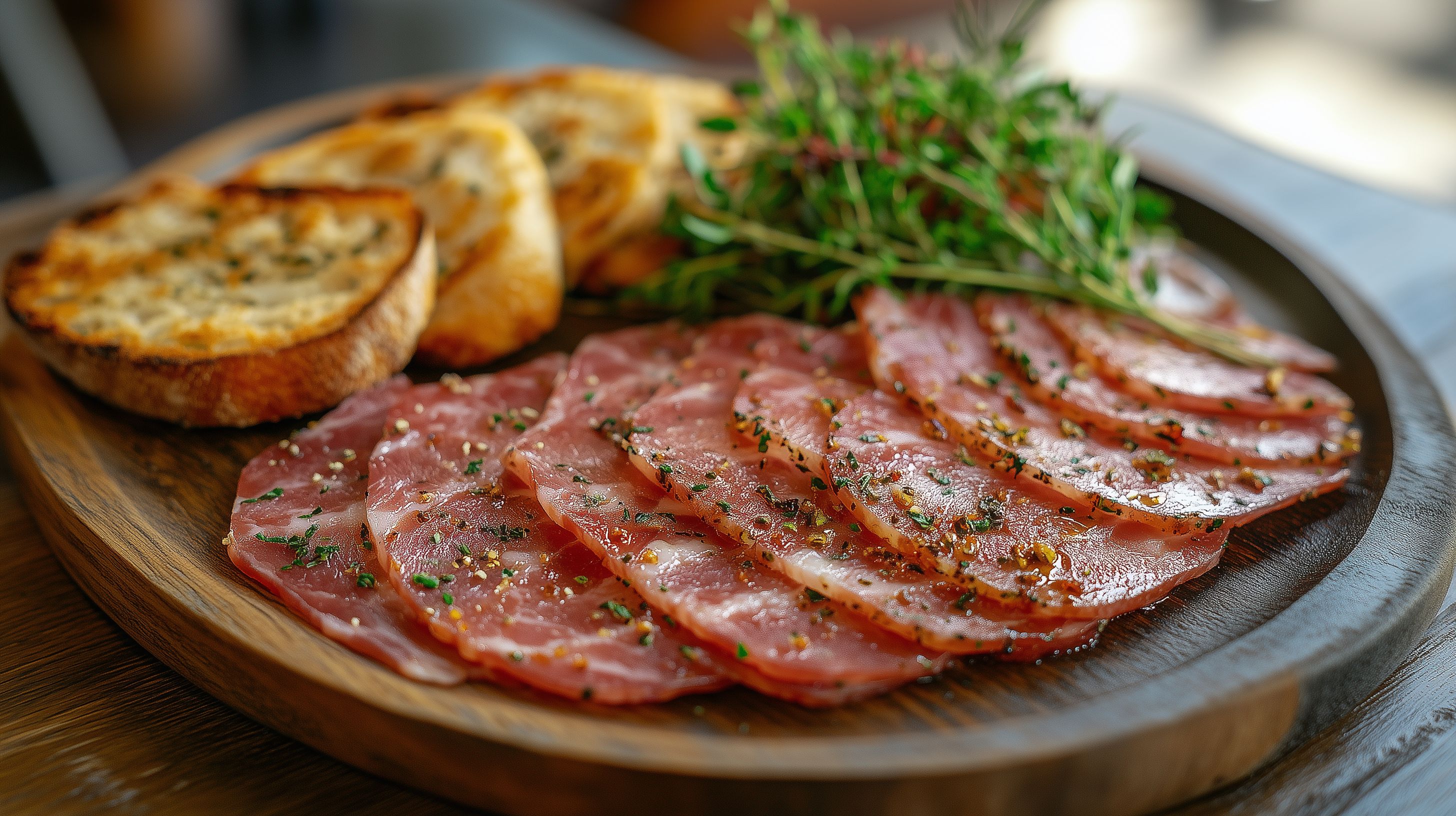 Dieses appetitlich angerichtete Foto zeigt eine traditionelle spanische Tapas-Platte mit dünn aufgeschnittenem Serrano-Schinken, dazu knuspriges Brot und frische Kräuter. Die Zutaten sind auf einem rustikalen Holzbrett angerichtet, was eine authentische, mediterrane Atmosphäre vermittelt. Das Foto eignet sich hervorragend als hochwertiges Stockfoto für Blogs, Websites oder Social-Media-Beiträge rund um spanische Küche, Genuss und Gastronomie. Das Bild ist in hoher Auflösung verfügbar und unter einer Creative-Commons-Lizenz kostenfrei nutzbar.