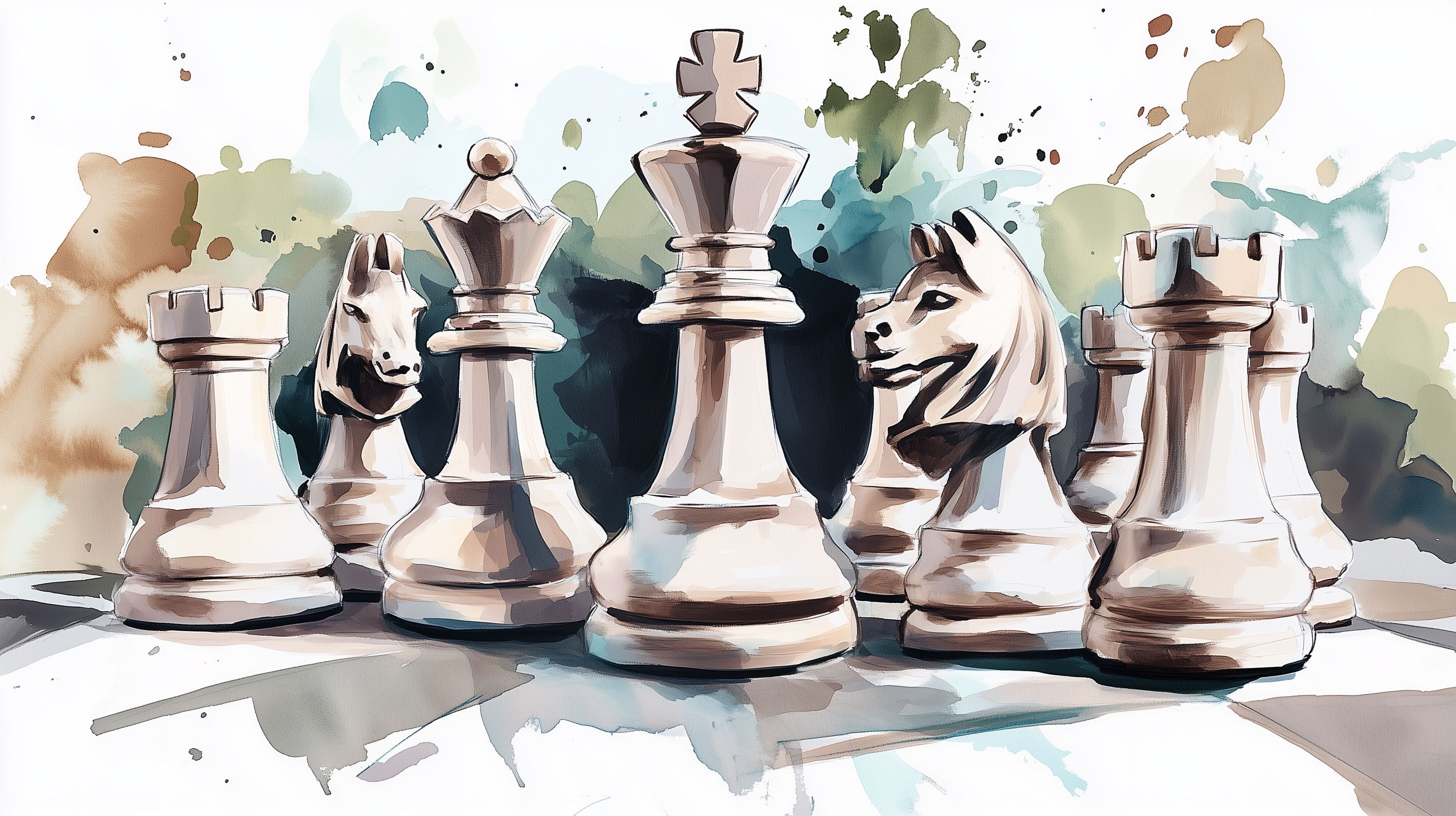 Dieses Bild zeigt eine detailreiche Illustration von Schachfiguren in einer kreativen Aquarellmalerei. Die Figuren, darunter Könige, Türme und Springer, sind in einer Komposition angeordnet, die einen künstlerischen und stilvollen Eindruck vermittelt. Der Hintergrund ist mit einer Farbwolke aus pastellfarbenen Tönen gestaltet, was der Szene eine malerische Atmosphäre verleiht.