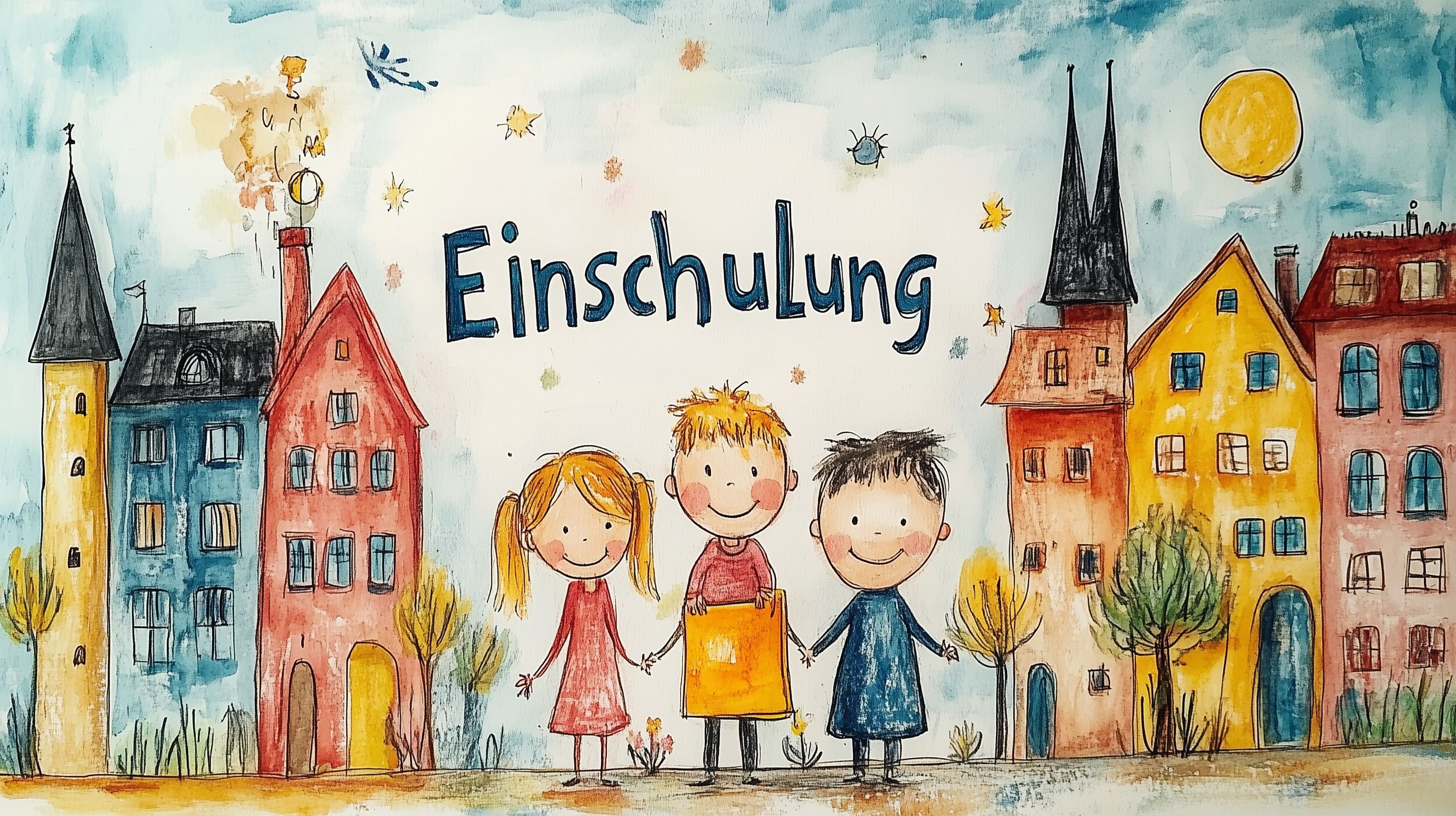Das fröhliche Bild zeigt eine bunte Illustration von Häusern und lachenden Kindern in einer fantasievollen Stadtlandschaft. Die detailreiche Zeichnung im Kinderkunststil vermittelt eine Atmosphäre von Freude, Spaß und Abenteuer, die ideal für die Darstellung einer Einschulung oder eines neuen Schuljahresbeginns geeignet ist. Das Motiv eignet sich hervorragend als Titelbild, Hintergrundbild oder Illustrationselement für Blogbeiträge, Werbekampagnen, Poster, Einladungen oder Kinderprodukte rund um den Schulstart. Als hochauflösendes Stockfoto unter einer Creative-Commons-Lizenz ist das Bild kostenfrei für eine Vielzahl an Projekten nutzbar.