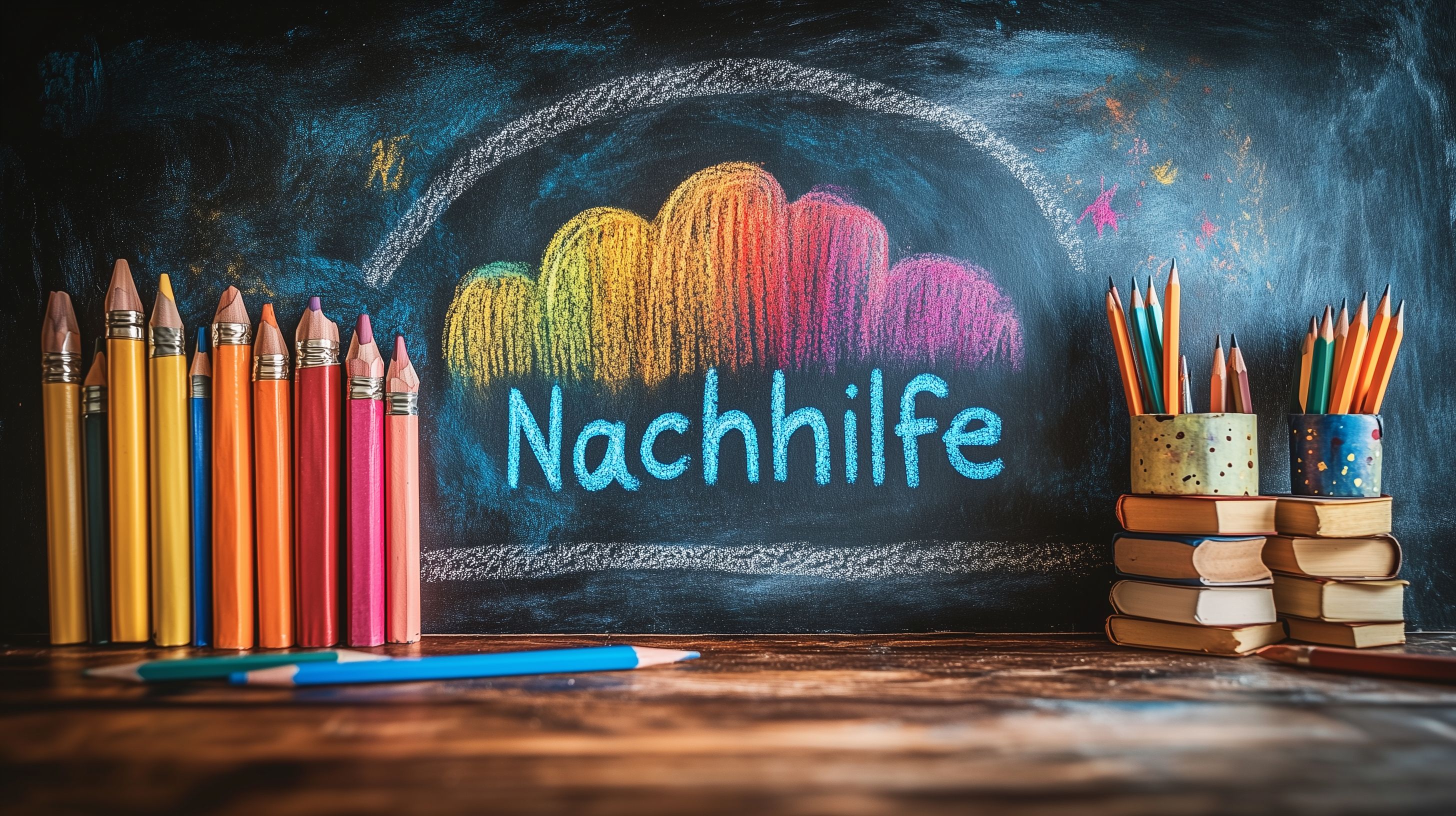 Das Bild zeigt eine bunte und kreative Szene auf einer Tafel. Darauf ist in Kreideschrift 'Nachhilfe' geschrieben, umgeben von farbenfrohen Kratzspuren und Formen, die an Feuerwerk oder Regenbogen erinnern. Davor liegen verschiedenfarbige Stifte, Bleistifte und Bücher, die den Lernkontext des Motivs unterstreichen. Das Arrangement vermittelt einen inspirierenden und pädagogischen Eindruck, der sich ideal für den Einsatz in Bildung, Kreativität und Nachhilfe eignet. Dieses hochwertige Stockfoto in hoher Auflösung steht unter einer Creative-Commons-Lizenz zur kostenlosen Nutzung zur Verfügung.