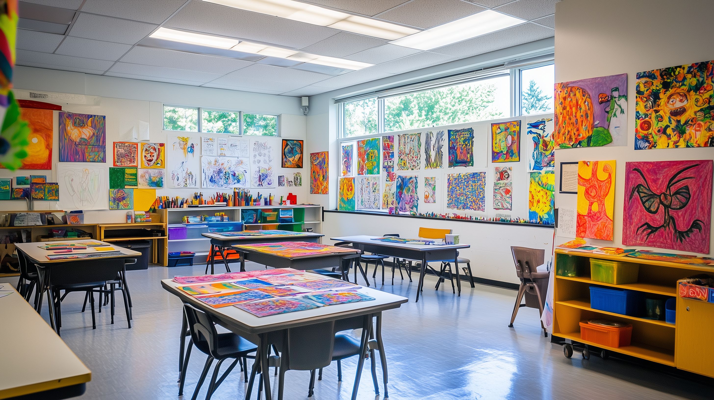 Das Bild zeigt einen farbenfroh gestalteten Klassenzimmer-Raum mit zahlreichen Schülerarbeiten an den Wänden. Die Wände sind mit bunten Gemälden, Collagen und Zeichnungen geschmückt, die eine kreative und inspirierende Lernatmosphäre schaffen. Der Raum wirkt einladend und fördert die Kreativität und das künstlerische Schaffen der Schüler. Dieses Stockfoto in hoher Auflösung eignet sich hervorragend für die Verwendung in Blogs, Newslettern, Social-Media-Kanälen oder Werbematerialien rund um die Themen Kunst, Bildung, Kreativität und Lernen. Das Foto steht unter einer Creative-Commons-Lizenz und kann somit kostenfrei genutzt werden.