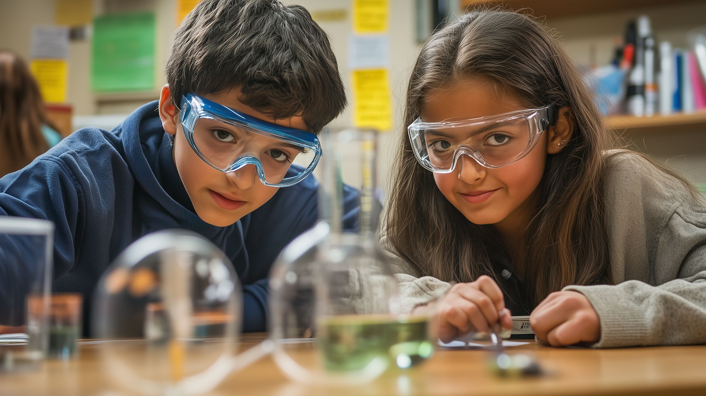 Das Bild zeigt zwei Schüler, die konzentriert an einem wissenschaftlichen Experiment arbeiten. Sie tragen Schutzbrillen und sitzen an einem Tisch, auf dem verschiedene Laborinstrumente und Materialien zu sehen sind. Der Hintergrund deutet auf ein Klassenzimmer oder einen Lehrraum hin, der mit Postern und Lernmaterialien ausgestattet ist. Das Bild vermittelt den Eindruck von Forschung, Wissenserwerb und Teamarbeit im Bildungskontext.