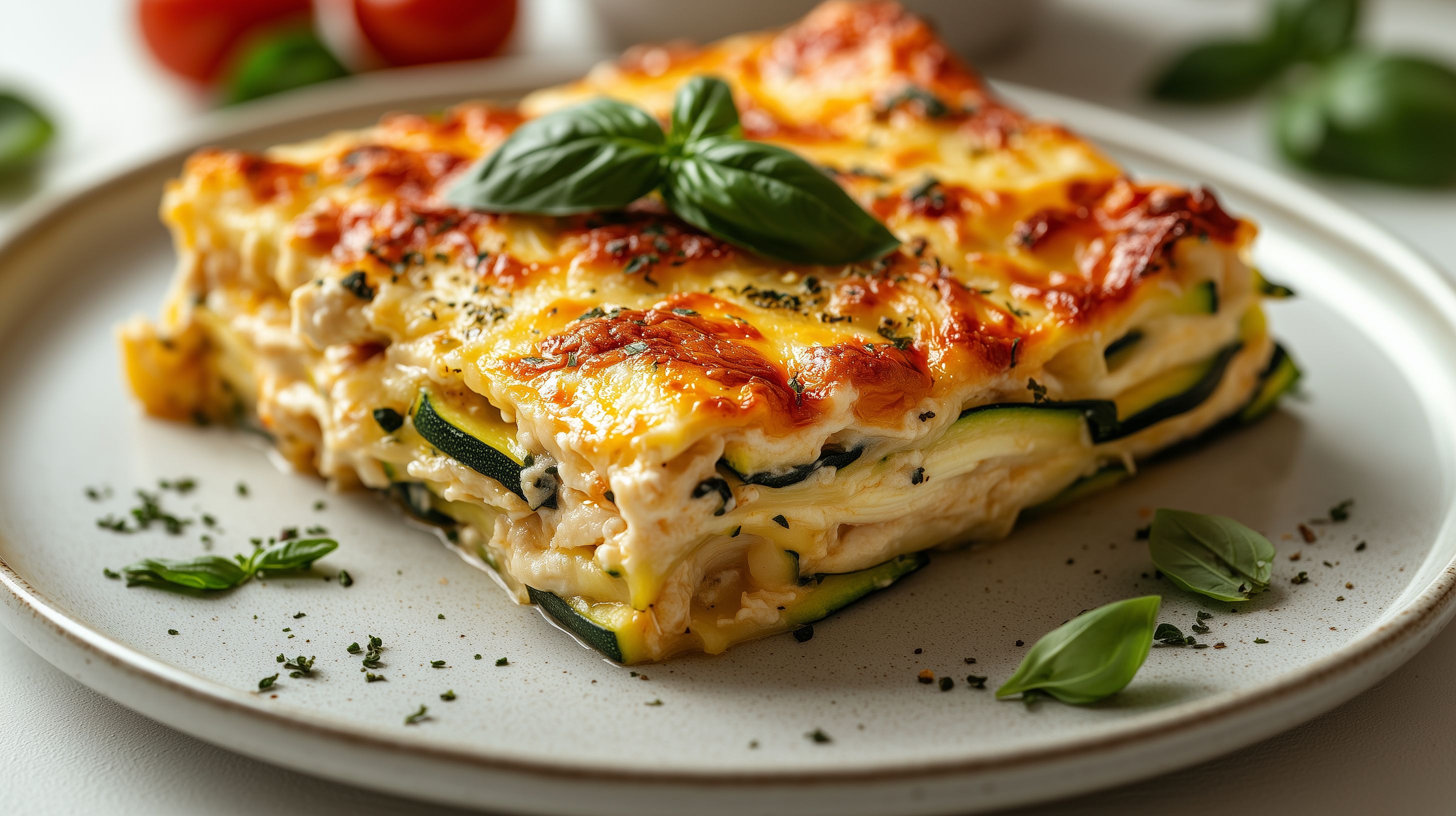 Dieses köstliche Bild zeigt eine appetitlich angerichtete Zucchini-Hähnchen-Lasagne auf einem hellen Teller. Die Lasagne ist mit einer goldbraunen, geschmolzenen Käsekruste überzogen und wird von frischen Basilikumblättern dekoriert. Die Sichtbarkeit der Zucchini-Scheiben und das helle Fleisch des Hühnchens lassen darauf schließen, dass es sich um eine ausgewogene, gesunde Mahlzeit handelt. Das Gericht wirkt appetitlich und hochwertig zubereitet, ideal als Hauptspeise für ein Mittagessen oder Abendessen. Dieses kostenlose Stockfoto in hoher Auflösung eignet sich perfekt für Blogbeiträge, Social-Media-Posts oder Werbematerial rund um italienische Küche, Familienrezepte oder gesunde Ernährung - veröffentlicht unter Creative Commons-Lizenz.