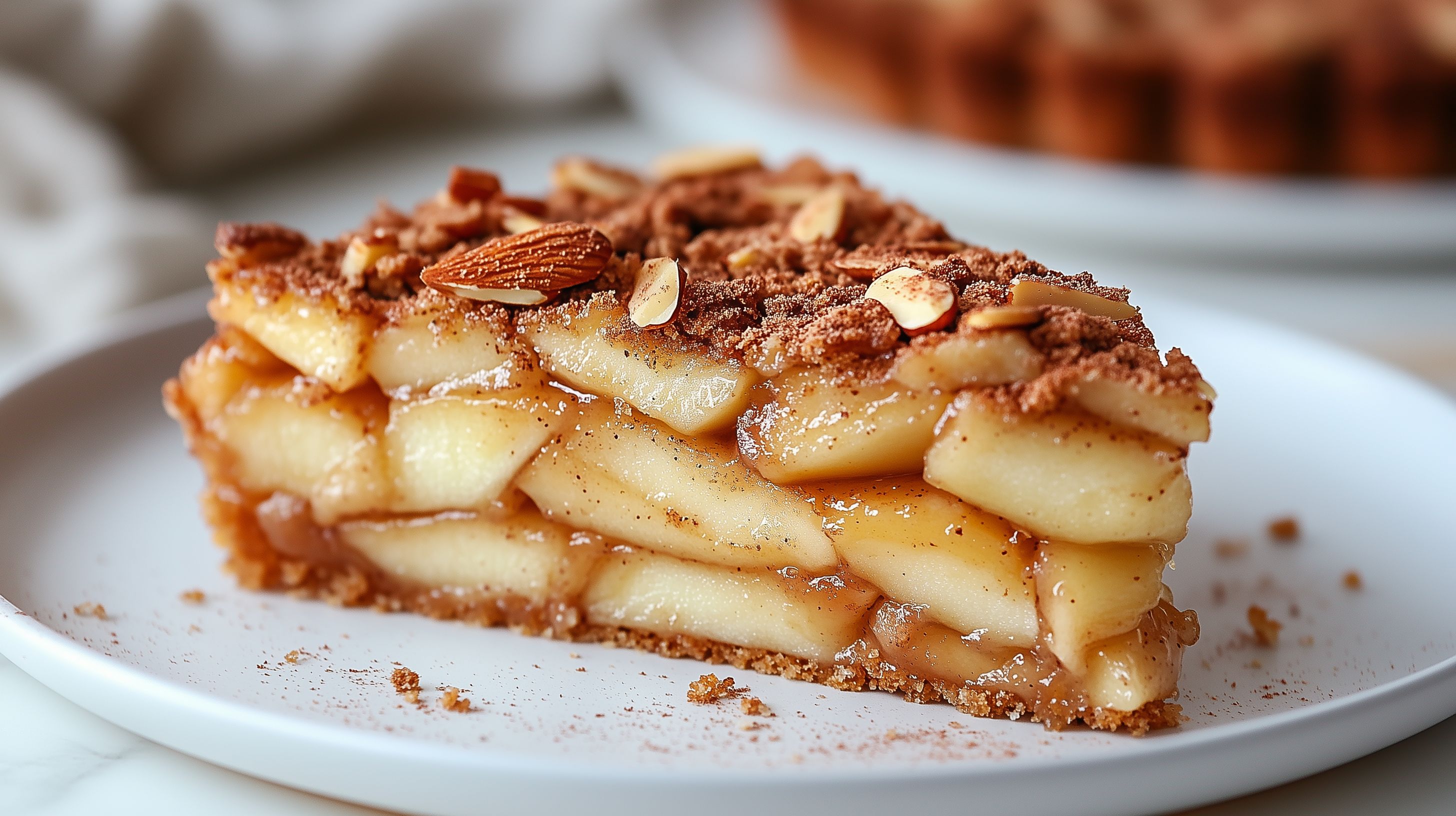 Dieses Foto zeigt einen leckeren, frischen Apfelkuchen mit einer knusprigen Mandelkruste. Der Kuchen ist auf einer weißen Platte angerichtet und wird von Zimtpulver umgeben. Die goldbraunen Mandelstückchen verleihen dem Dessert eine köstliche Textur und einen natürlichen Geschmack. Dieser herbstliche Genuss eignet sich ideal als Foto für Blogs, Newsletter, Social-Media-Posts oder Werbung. Dieses hochauflösende, kostenlose Stockfoto mit Creative-Commons-Lizenz bietet eine authentische, appetitliche Darstellung des Apfelkuchens.