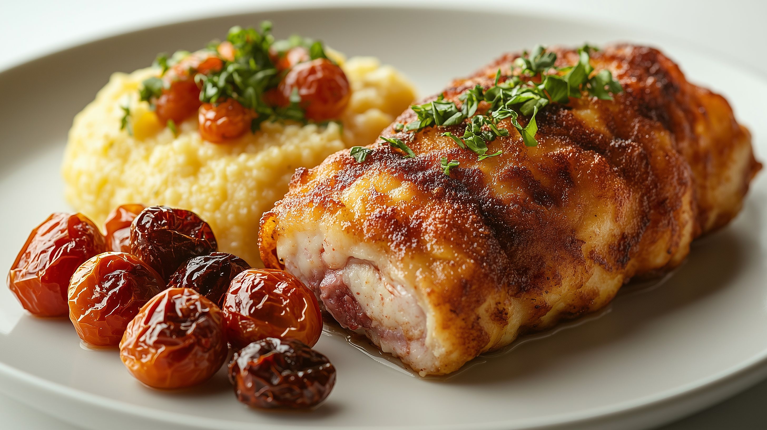 Dieses Foto zeigt ein knuspriges Cordon Bleu, umhüllt von einer goldbraunen Panade, serviert mit cremiger Polenta und kandierten Kirschtomaten. Das Gericht präsentiert sich auf einem hellen Teller ansprechend angerichtet, die Farben von Rot, Gelb und Grün bilden einen stimmungsvollen Kontrast. Das Foto eignet sich hervorragend als hochwertiges Stockfoto für Lebensmittel-, Kochrezept- oder Restaurantportale, Blogs, Newsletter oder Social-Media-Kanäle. Es ist in hoher Auflösung verfügbar und steht unter einer Creative-Commons-Lizenz zur Verfügung.