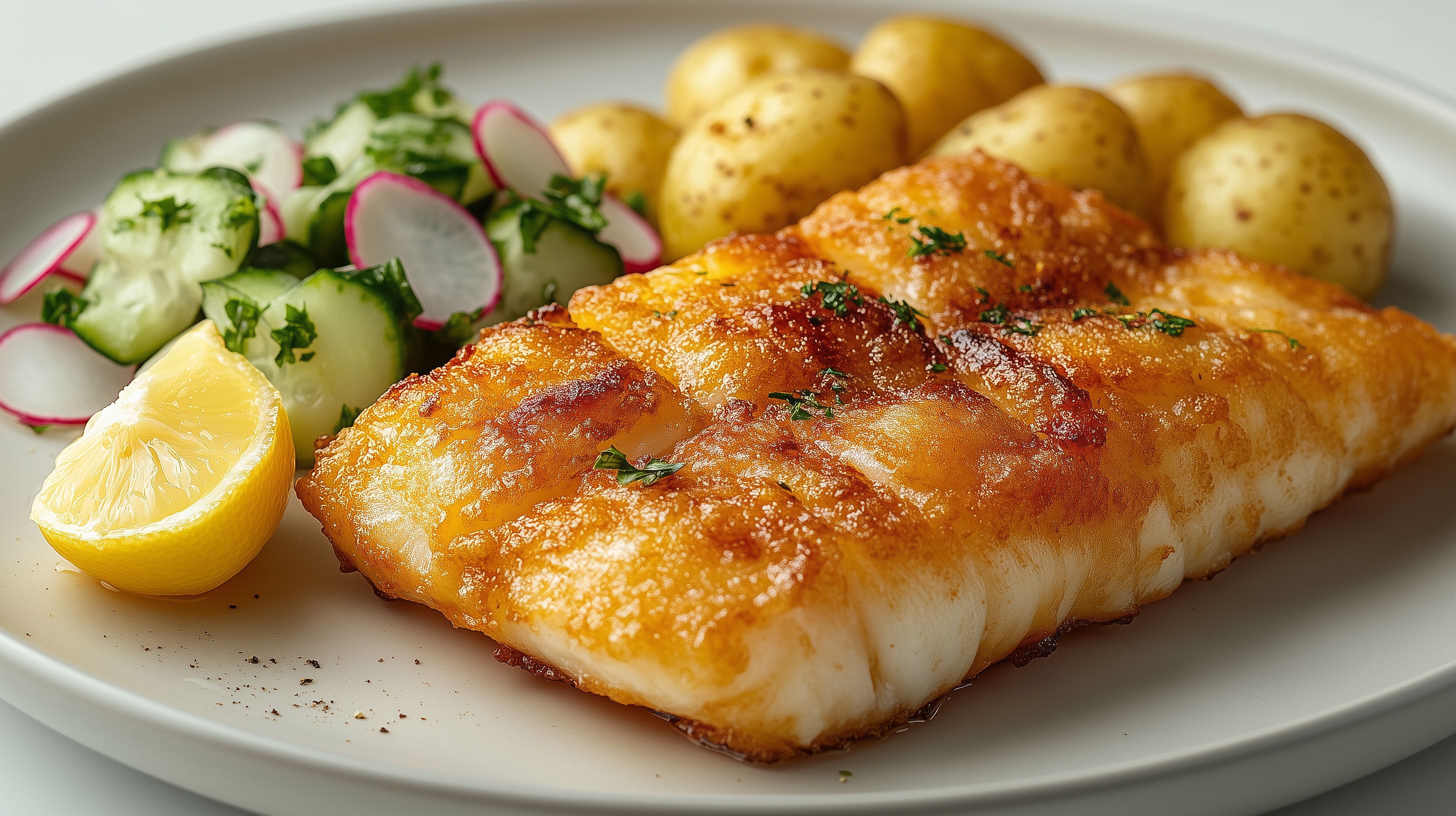 Dieses Foto zeigt ein leckeres Fischgericht mit knusprig gebratenem Fischfilet, serviert mit goldbraunen Kartoffeln und einem frischen Salat. Das Arrangement ist auf einem weißen Teller angerichtet und wird durch eine Scheibe Zitrone abgerundet. Das Foto ist in einer schönen, natürlichen Beleuchtung aufgenommen, wodurch die Farben und Texturen besonders gut zur Geltung kommen. Dieses stimmungsvolle Bild eignet sich hervorragend als kostenloses Stockfoto für Rezeptblogbeiträge, Werbung für gesunde Ernährung oder Artikel zur Kulinarik. Die hochauflösende Datei steht unter einer Creative Commons-Lizenz zur freien Nutzung zur Verfügung.