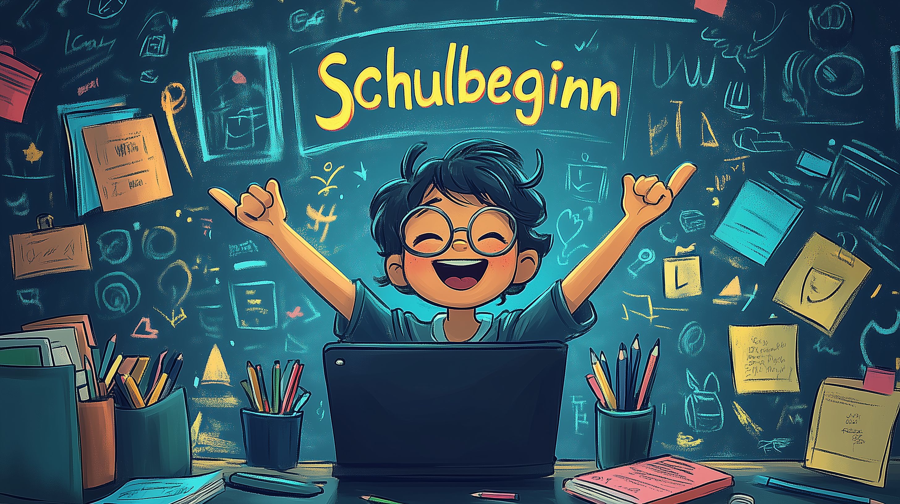 Dieses farbenfrohe Stockfoto zeigt einen begeisterten Schüler, der mit erhobenen Armen vor einem Laptop sitzt. Der Hintergrund ist mit kreativen Elementen wie Malutensilien, einer Tafel und anderen Schulobjekten gefüllt, was eine inspirierende Lernumgebung suggeriert. Das Bild eignet sich hervorragend für Blog-Beiträge, Newsletter-Layouts oder soziale Medien rund um das Thema Schule, Bildung und Lernen. Das hochauflösende Foto ist unter einer Creative-Commons-Lizenz frei verwendbar.