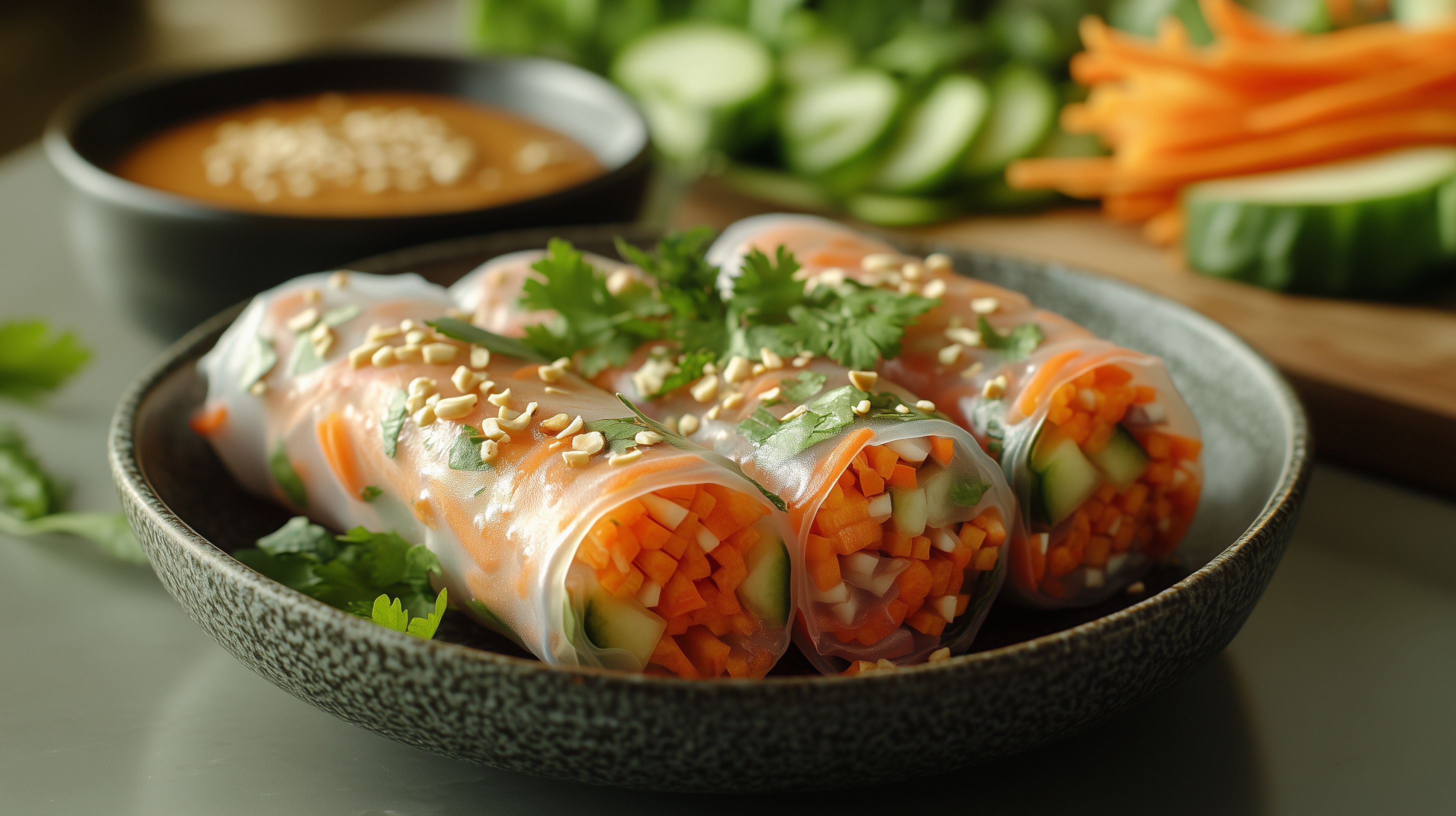 Dieses Bild zeigt frisch zubereitete vietnamesische Frühlingsrollen auf einer rustikalen Holzschale. Die transparenten Rollen sind gefüllt mit knackigem Gemüse wie Möhren und Gurke sowie mit grünen Kräutern wie Koriander. Neben den Rollen ist eine kleine Schale mit einer leckeren, cremigen Erdnusssauce zu sehen, die perfekt als Dip für die Frühlingsrollen geeignet ist. Die Farben und Texturen der Zutaten verleihen dem Gericht einen frischen und einladenden Gesamteindruck. Dieses Stockfoto eignet sich hervorragend für Rezepte, Foodblogs, Social-Media-Beiträge oder Werbung für gesunde, natürliche Lebensmittel und Catering-Angebote. Es ist in hoher Auflösung verfügbar und kann unter einer Creative-Commons-Lizenz kostenfrei genutzt werden.
