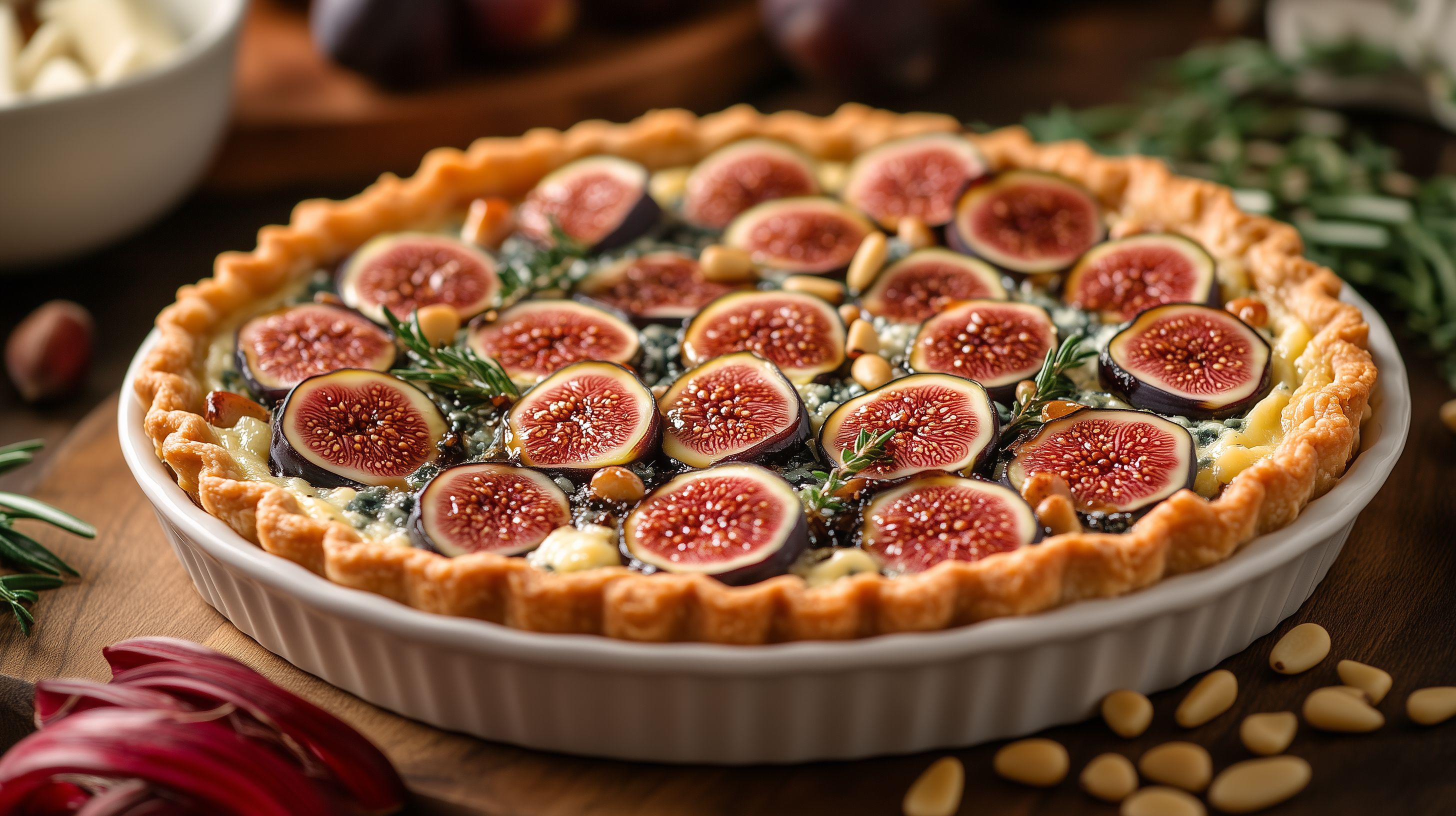 Dieses köstliche Foto zeigt eine frisch gebackene Feigentarte mit einer knusprigen, goldbraunen Kruste. Die roten, reifen Feigen sind kunstvoll in einer rustikalen Keramikform angeordnet und verleihen dem Gericht ein einladendes, natürliches Aussehen. Umgeben ist die Tarte von frischen Rosmarinzweigen, die ihr einen herzhaften, mediterranen Touch verleihen. Das Bild strahlt Gemütlichkeit und Genuss aus und lässt den Betrachter förmlich die würzigen Aromen der Tarte riechen. Das hochwertige Stockfoto eignet sich hervorragend für die Verwendung in Foodblogs, Rezeptsammlungen, Werbung für Backzubehör oder Social-Media-Posts rund um das Thema Backen und Genuss. Mit seiner hohen Auflösung und den kreativen Gestaltungselementen ist dieses Foto ein echter Blickfang und darf in keiner passenden Sammlung kostenlosen Bildmaterials fehlen.