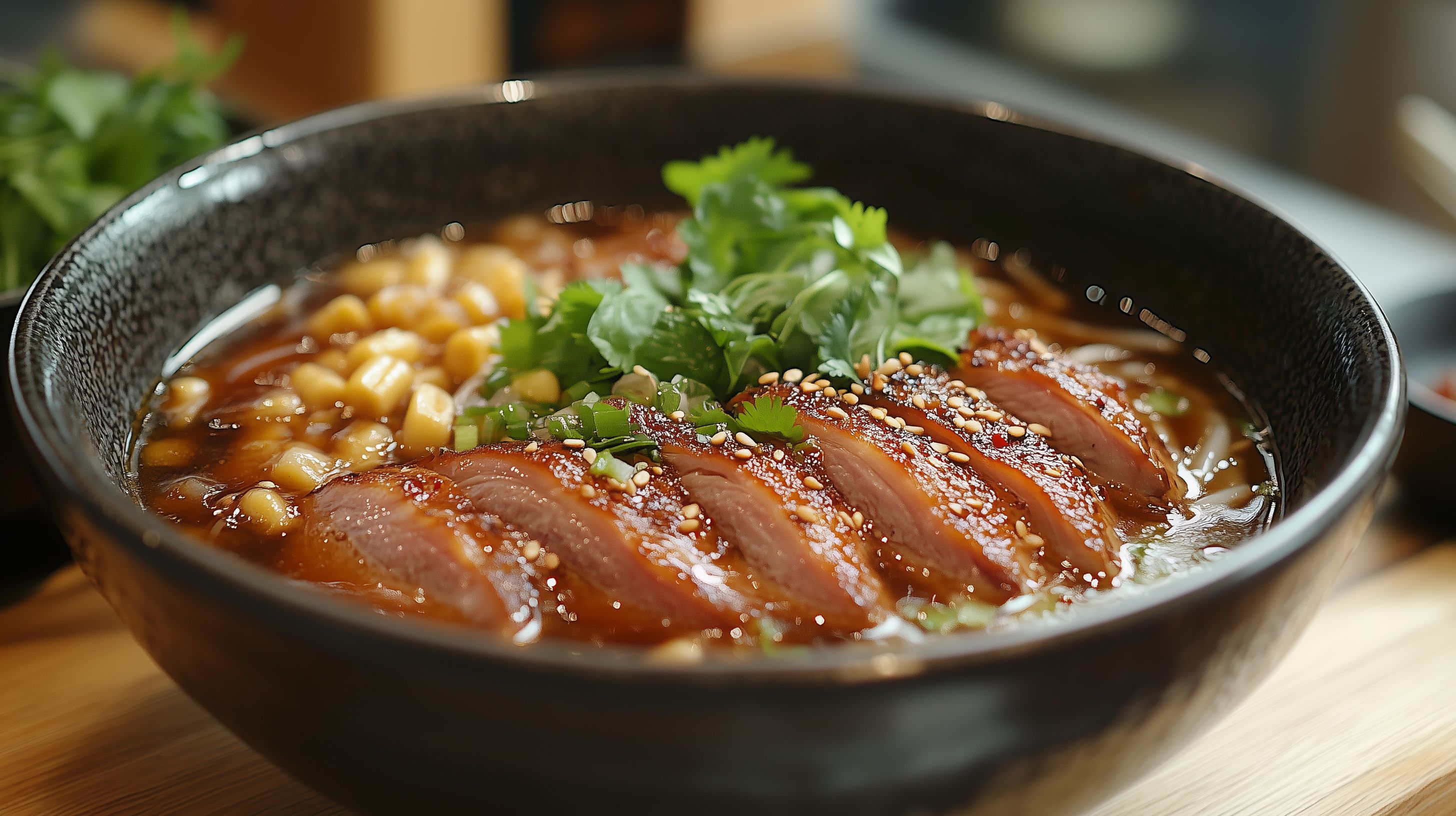 Das Bild zeigt eine köstliche Pho-Suppe, ein traditionelles vietnamesisches Gericht. Die Suppe ist in einer rustikalen, schwarzen Schale serviert und präsentiert sich mit zarten Scheiben Entenfleisch, frischen Kräutern wie Koriander sowie einer würzigen, sättigenden Brühe. Die Nahaufnahme lässt die Texturen und Farben des Gerichts sehr appetitlich erscheinen. Dieses Foto eignet sich hervorragend als Begleitung zu Restaurantmenüs, Rezeptideen oder Beiträgen zum Thema asiatische Küche in Blogs, Newslettern und sozialen Medien. Als hochauflösendes, kostenloses Stockfoto unter Creative-Commons-Lizenz ist es vielseitig einsetzbar.