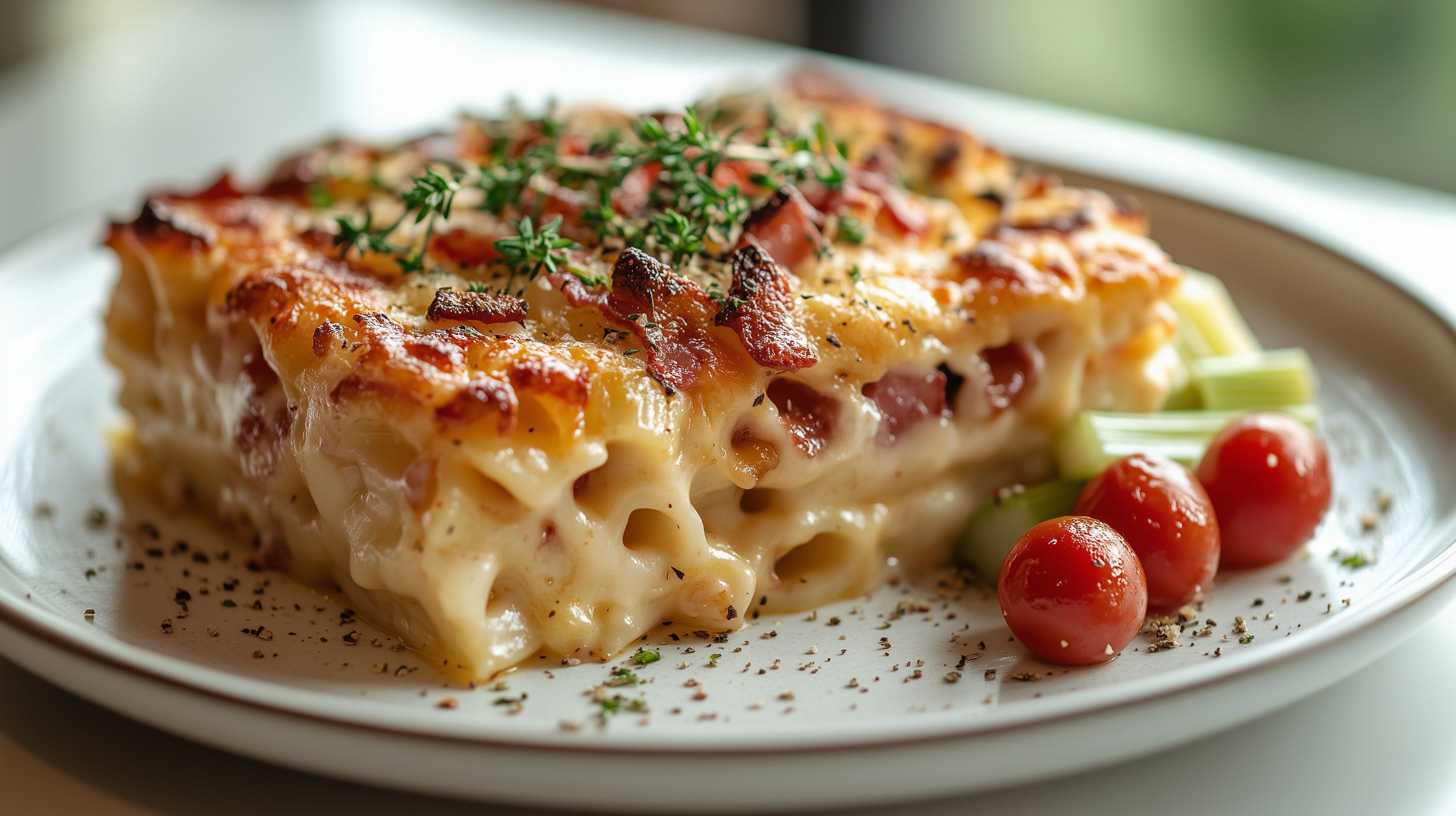 Das Bild zeigt einen leckeren, ofenfrischen Nudelauflauf mit knusprigem Speck und einer cremigen Käsesauce. Die Nudeln sind leicht gebräunt und mit frischen Kräutern dekoriert, was dem Gericht eine rustikale und appetitliche Optik verleiht. Der Auflauf ist auf einem hellen Holztisch serviert und wird von frischen Kirschtomaten begleitet, die zusätzliche Frische und Farbe in das Bild bringen. Dieses hochwertige Stockfoto eignet sich perfekt für Rezeptblogs, Kochbücher, Restaurantwebsites oder auch für die Verwendung in Social-Media-Beiträgen rund um das Thema Kulinarik. Es ist in hoher Auflösung und unter einer Creative-Commons-Lizenz frei nutzbar.