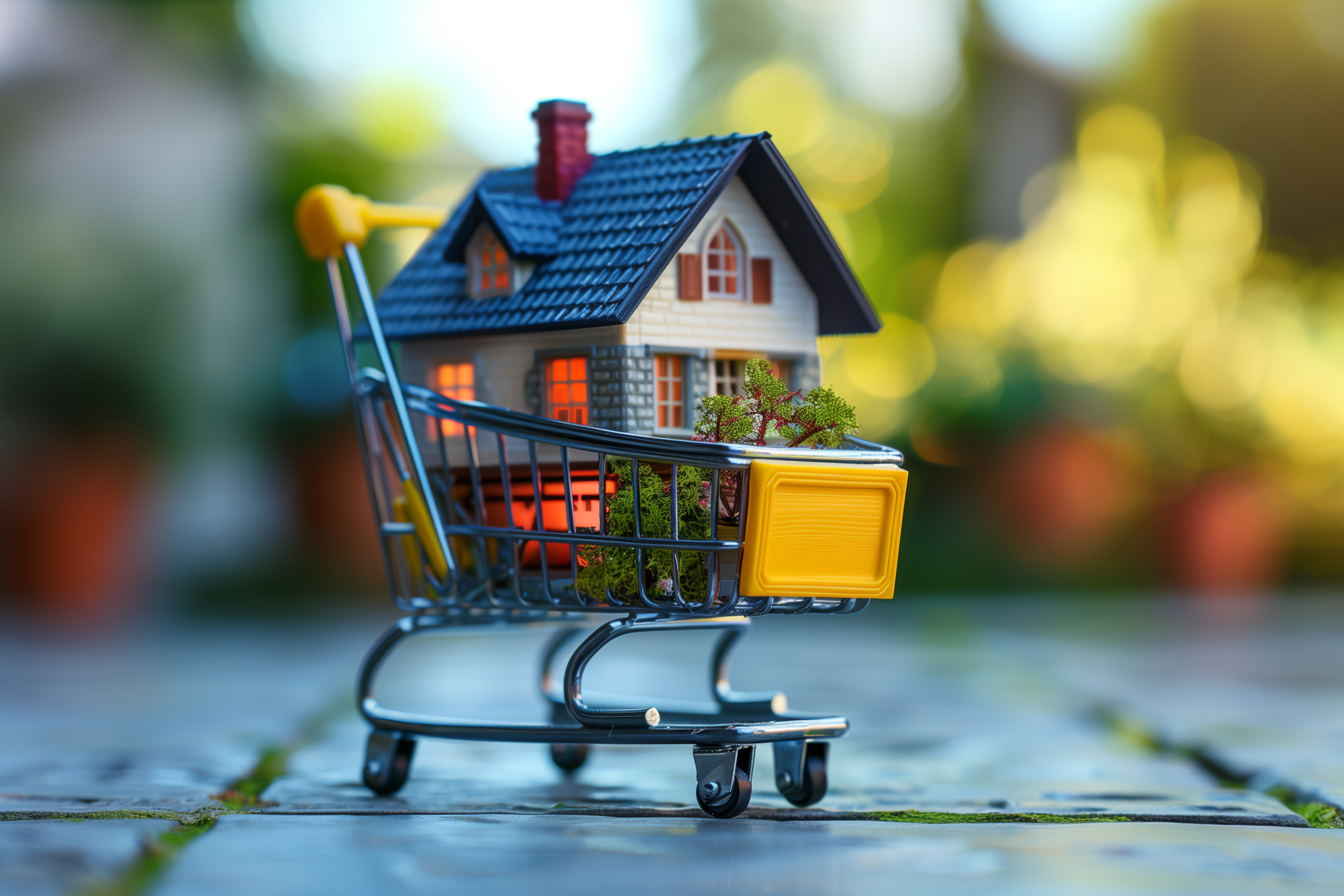 Das Bild zeigt ein Spielzeughaus, das in einem Einkaufswagen platziert ist. Das Haus ist detailliert gestaltet und wird vor einer unscharfen, natürlichen Umgebung mit Bokeh-Effekt präsentiert. Diese Komposition vermittelt ein Konzept des Besitzens und Erwerbens von Immobilien. Das Foto kann für Artikel zu Themen wie Immobilienmarkt, Wohnungskauf oder Hypotheken verwendet werden. Es eignet sich auch für Werbung und Social-Media-Beiträge rund um das Thema Zuhause und Wohnen. Dieses kostenlose Stockfoto in hoher Auflösung steht unter der Creative-Commons-Lizenz zur Verfügung.