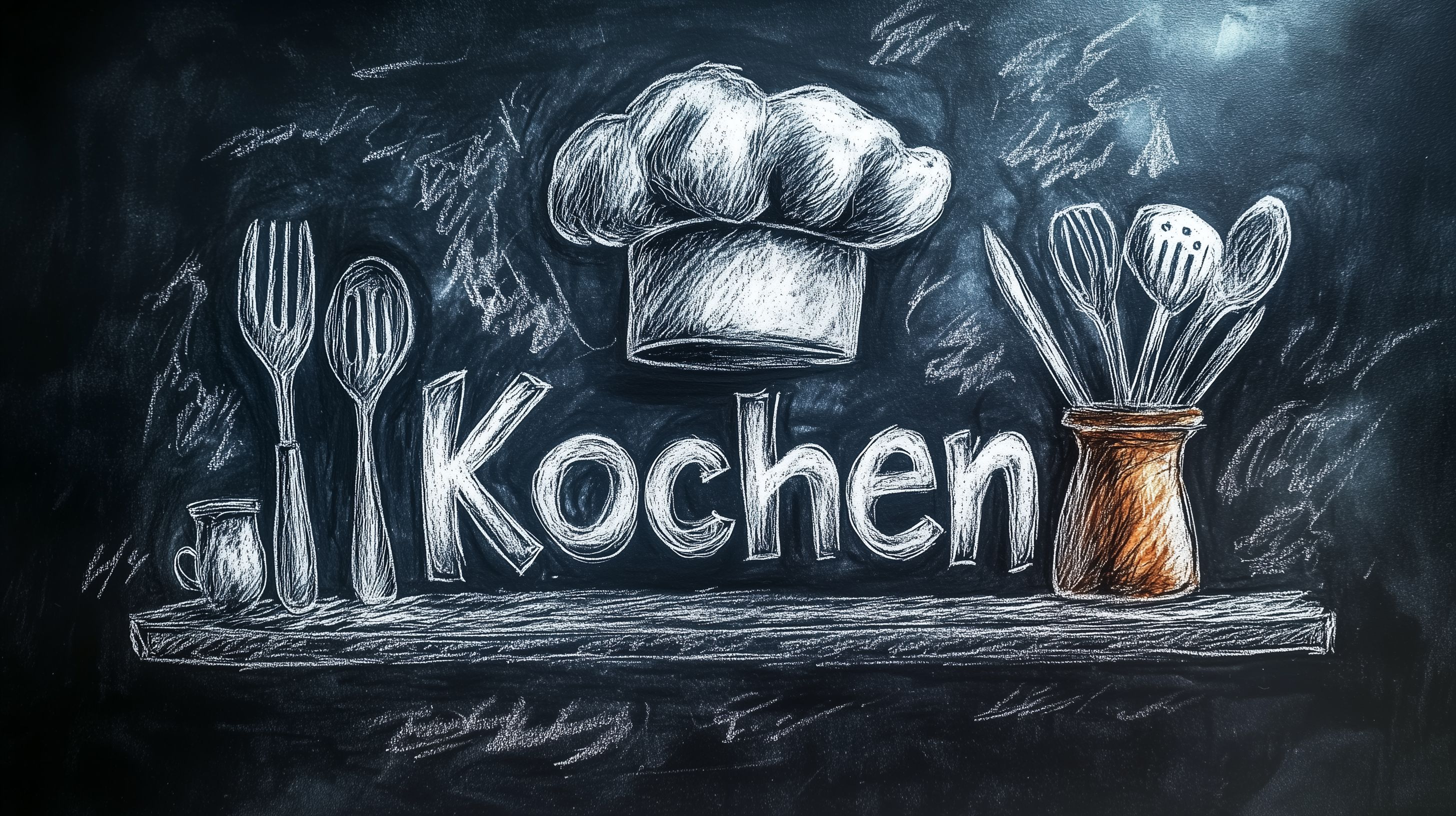 Dieses grafisch gestaltete Kreide-Bild zeigt eine Vielzahl von Küchenutensilien wie Löffel, Gabel und Krug sowie einen prominent platzierten Kochmützenschriftzug. Die Illustration hat einen handgemalten, rustikalen Charakter und ist in einem Schwarz-Weiß-Farbschema gehalten. Das Bild eignet sich ideal für den Einsatz in Kochbüchern, Kochkursen, Menüs oder Blogbeiträgen rund um das Thema Kochen und Backen. Als kostenloses Hochauflösungs-Stockfoto unter einer Creative-Commons-Lizenz ist es frei verwendbar.