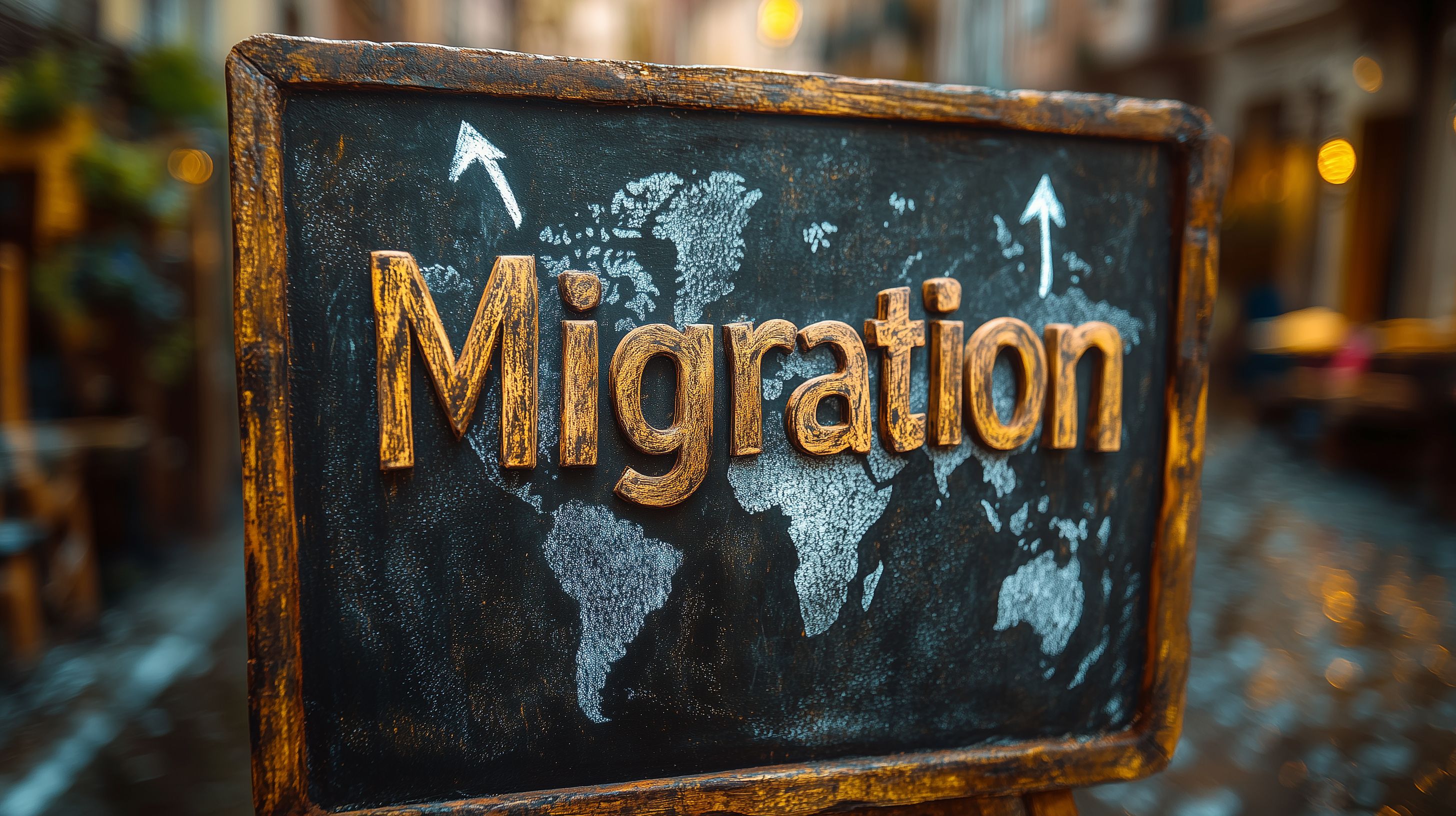 Dieses Bild zeigt ein Symbolbild für das Thema globale Migration und Wanderungsbewegungen. Es zeigt eine alte, rustikale Tafel mit der Aufschrift 'Migration' und einer Weltkarte im Hintergrund. Pfeile in verschiedene Richtungen deuten die Bewegung und Dynamik von Wanderungsprozessen an. Das Bild hat einen Vintage-Stil mit Grunge-Elementen und einem hölzernen Rahmen, was eine ernsthafte, historische Perspektive auf das Thema vermittelt.