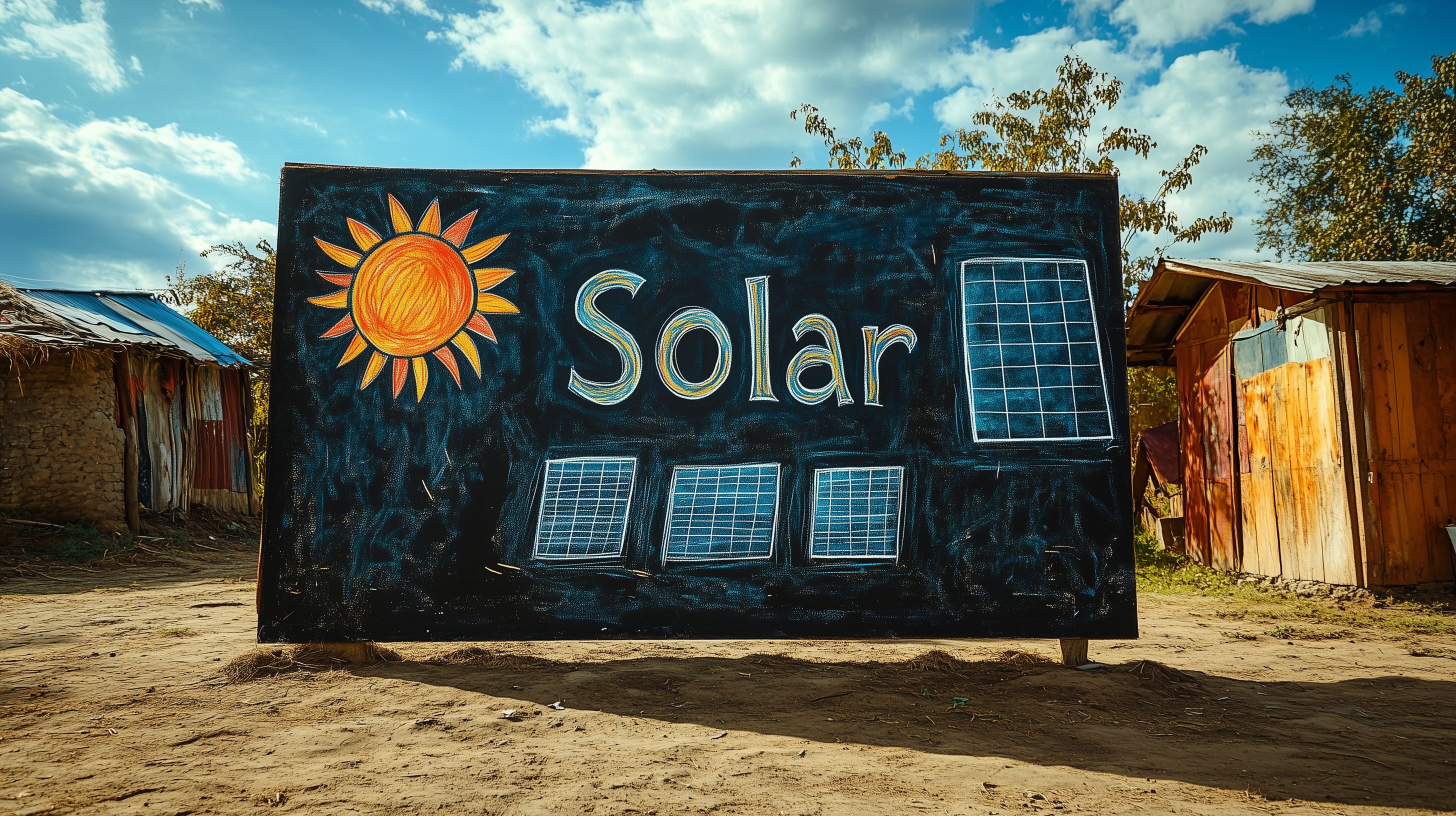 Das Foto zeigt ein großes Informationsschild mit dem Wort 'Solar' in der Mitte. Das Schild ist von einer ländlichen Umgebung mit Holzhütten und Bäumen umgeben. Über dem Schild ist eine strahlende Sonne abgebildet, während unten drei Solarmodule zu sehen sind. Die Farbgebung ist sehr expressiv, mit einem dunklen Hintergrund, orangenem Sonnenmotiv und blauen, grünen sowie weißen Elementen.