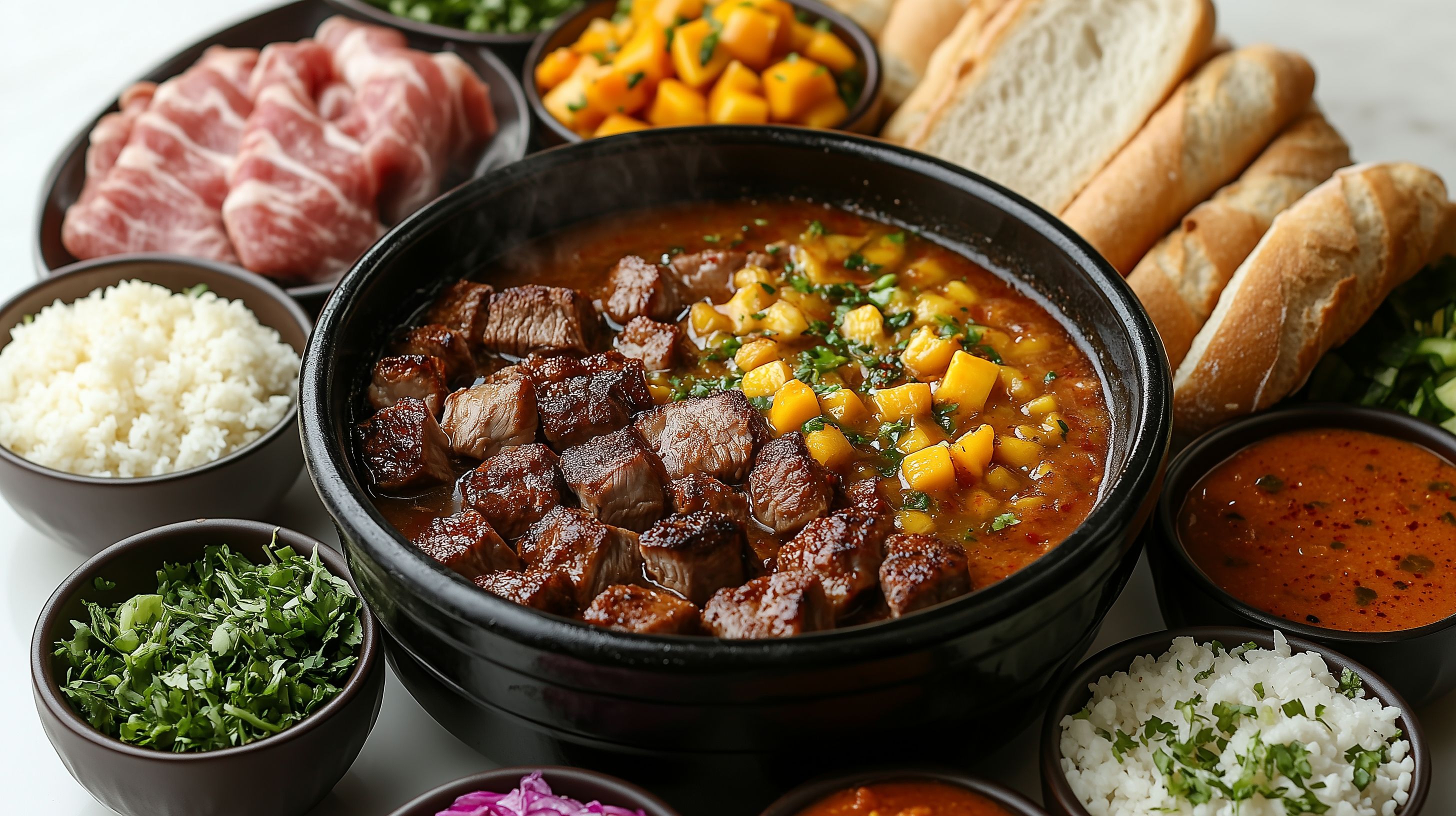 Dieses Foto zeigt einen dampfenden Topf mit leckeren Rindergulasch, der mit würzigen Gewürzen und frischen Gemüsebeilagen serviert wird. Die Komposition mit den seitlich arrangierten Komponenten wie Reis, Salat und Dips schafft eine einladende, rustikale Optik. Das Bild eignet sich hervorragend für die Verwendung in Rezeptbüchern, Foodblogs oder Werbeanzeigen für authentische, hausgemachte Gerichte. Als hochauflösendes Stockfoto unter Creative-Commons-Lizenz kann es kostenfrei für verschiedenste Zwecke genutzt werden.