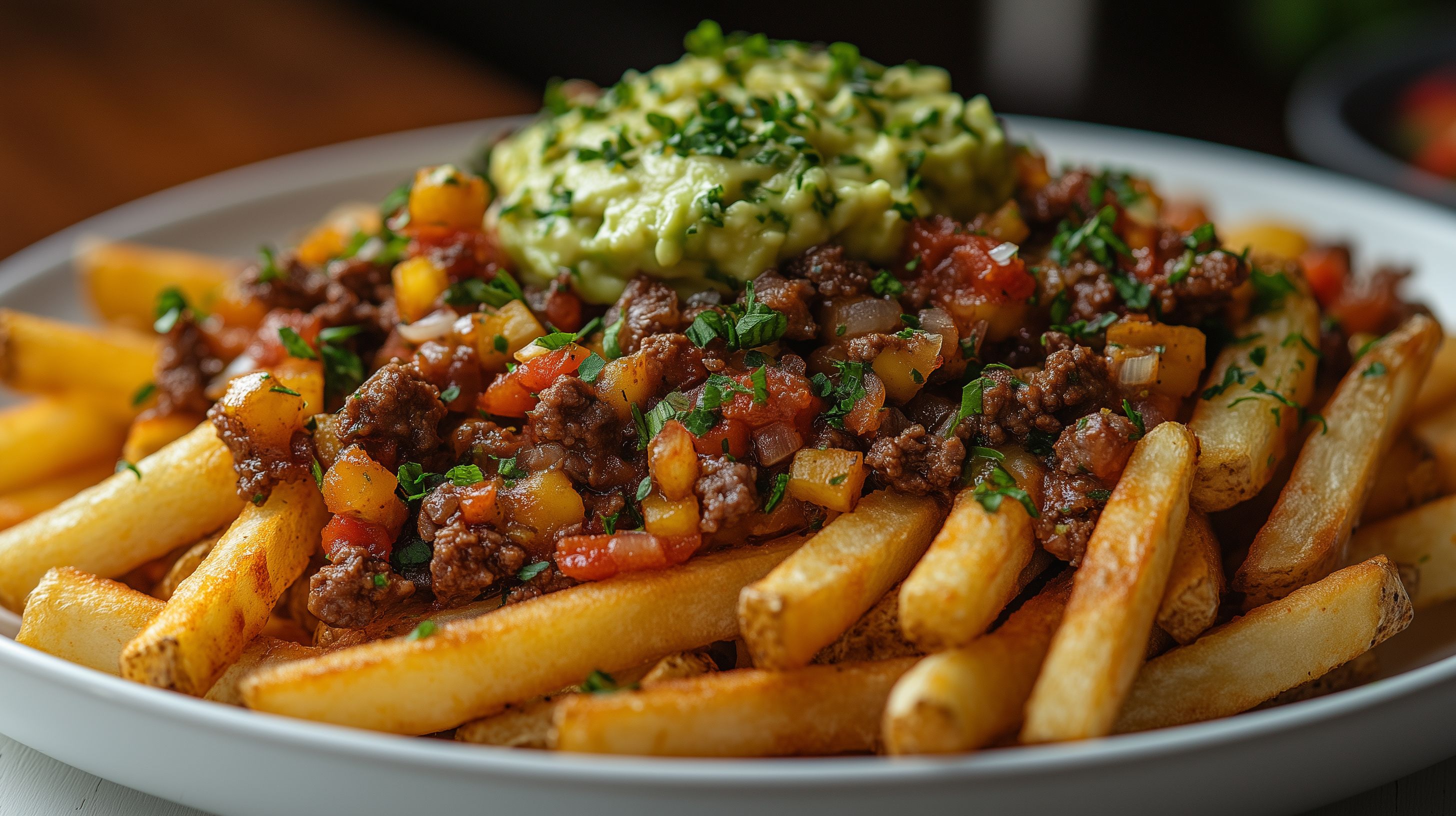 Dieses verlockende Gericht zeigt eine Anordnung von knusprigen Pommes frites, die mit einer würzigen Hackfleischmischung und einer cremigen Avocado-Creme garniert sind. Die bunte Mischung von Rot, Gelb und Grün verleiht dem Bild eine appetitliche Optik. Das Foto eignet sich perfekt für die Verwendung in Artikeln zu Themen wie Fast Food, rustikale Küche oder deftige Hauptgerichte. Als kostenloses Stockfoto in hoher Auflösung unter einer Creative-Commons-Lizenz kann es in vielfältigen Kontexten eingesetzt werden, wie zum Beispiel in Blogs, Social-Media-Posts oder Werbematerialien.