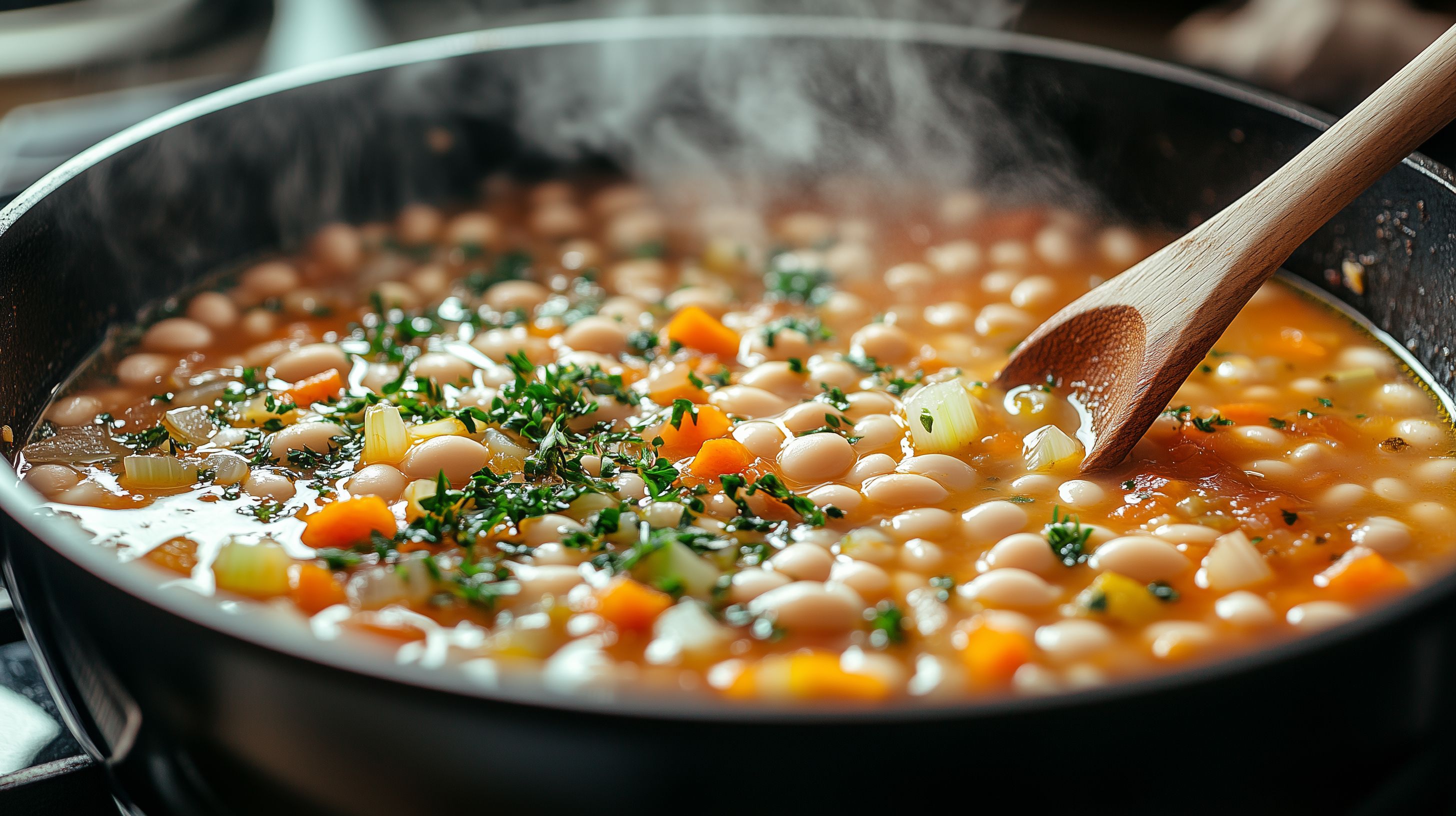 Das Bild zeigt einen köchelnden Gemüseeintopf in einer schwarzen Pfanne. Die dampfende Suppe ist mit verschiedenen Zutaten wie Lauch, Karotten, Bohnen und frischen Kräutern angereichert. Der Holzlöffel, der in den Topf getaucht ist, verleiht dem Gericht eine rustikale Note. Diese Szene strahlt Wärme und Gemütlichkeit aus und lädt dazu ein, dieses leckere, gesunde und vegetarische Gericht selbst zuzubereiten. Als kostenloses Stockfoto in hoher Auflösung und unter Creative Commons-Lizenz eignet sich das Bild perfekt für Blogs, Newsletter, Social-Media-Beiträge oder Werbezwecke rund um das Thema Kochen, Ernährung und Gesundheit.