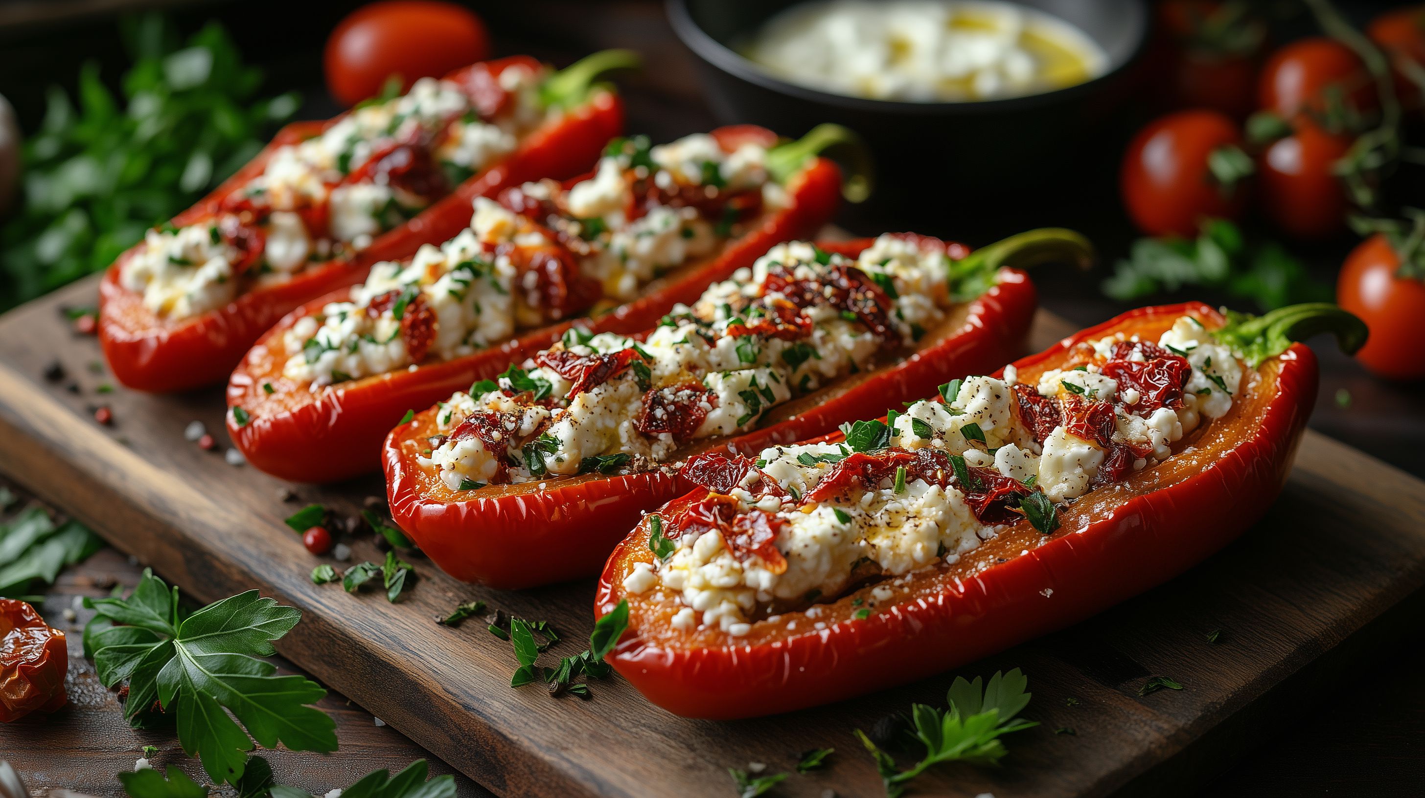 Dieses Foto zeigt eine köstliche Auswahl an gefüllten Paprikahälften, die auf einem rustikalen Holzbrett angerichtet sind. Die Paprikastücke sind mit einer appetitlichen Füllung aus Käse, Kräutern und getrockneten Tomaten gefüllt, die einen leckeren Kontrast zu der knackigen Paprikahaut bildet. Das Gericht ist farbenfroh und wirkt frisch und natürlich. Es eignet sich hervorragend als Vorspeise, Beilage oder Hauptgericht und ist perfekt für einen mediterranen Sommergenuss. Dieses hochauflösende Stockfoto ist unter einer Creative-Commons-Lizenz frei nutzbar, z.B. für Ihre Blogs, Newsletter oder Werbekampagnen.