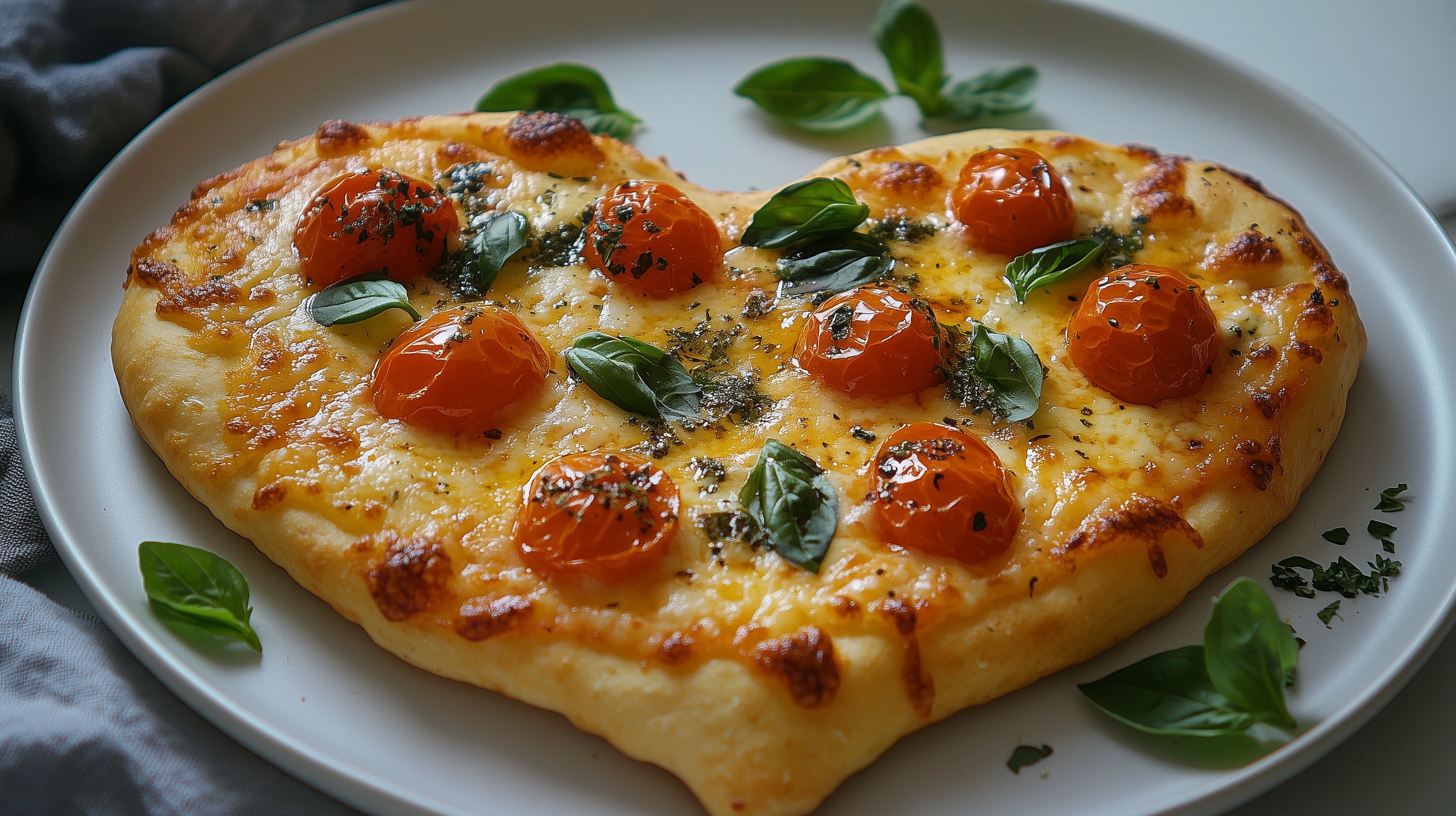 Das Bild zeigt eine köstliche selbstgemachte Pizza mit gegrillten Kirschtomaten und frischem Basilikum. Die Pizza hat eine herzförmige Gestalt und eine knusprig-goldene Kruste, die einen verlockenden Kontrast zu den saftigen, reifen Tomaten und dem aromatischen Basilikum bietet. Die Komposition ist stimmungsvoll und appetitlich, mit einem rustikalen, italienischen Charakter. Dieses hochwertige Stockfoto in hoher Auflösung eignet sich hervorragend für die Verwendung in Rezepten, Kochbüchern, Blogbeiträgen oder Werbeanzeigen rund um das Thema Pizza, Kochen und mediterrane Küche. Es steht unter der Creative-Commons-Lizenz zur kostenlosen Nutzung zur Verfügung.