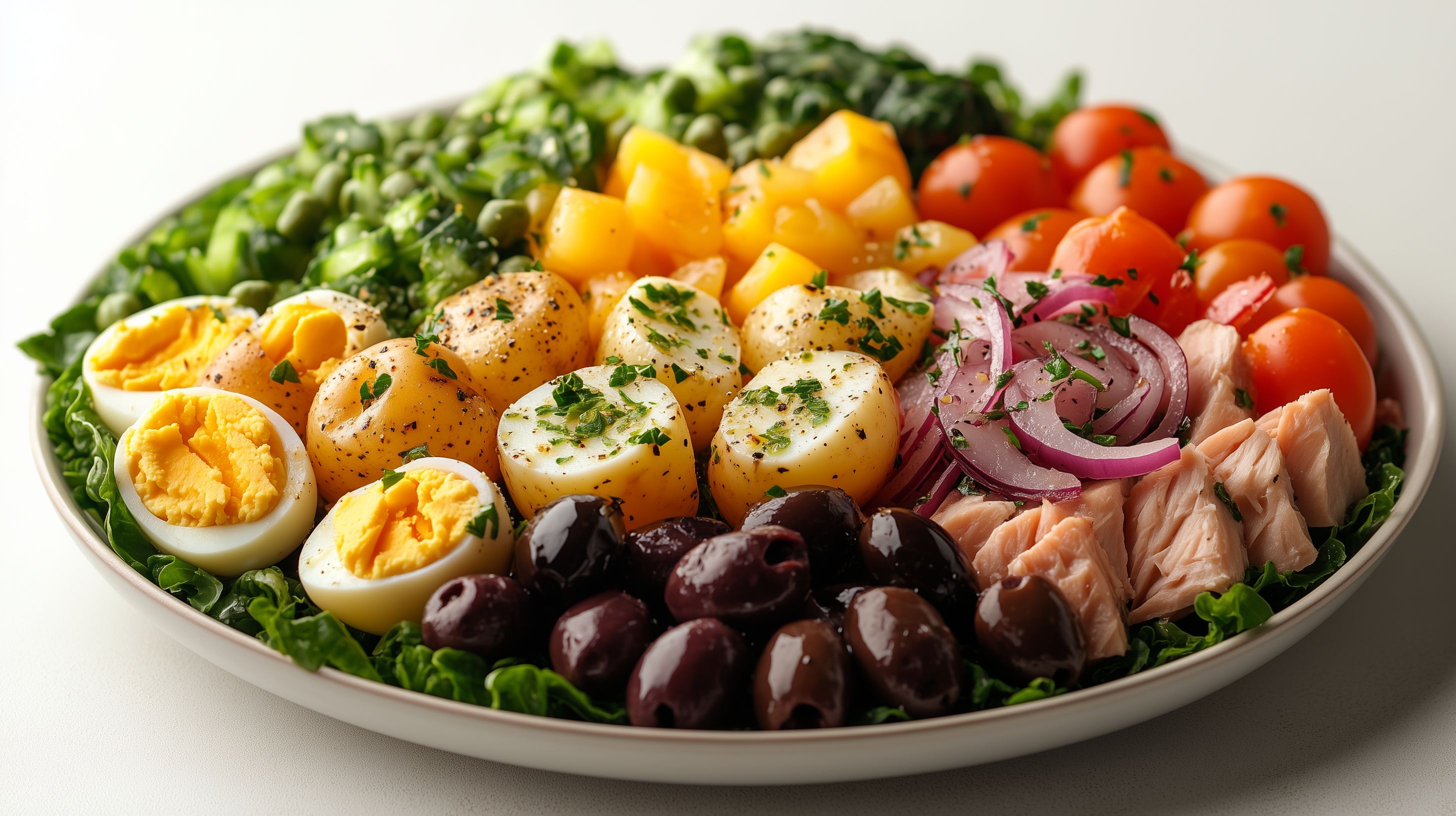 Dieses Foto zeigt einen leckeren, frisch zubereiteten Salat Niçoise in einer rustikalen Schüssel. Der Salat ist bunt und besteht aus verschiedenen, sorgfältig arrangierten Zutaten: knackiger grüner Salat, saftige Tomaten, gekochte Eier, Thunfisch-Happen, schwarze Oliven und rote Zwiebelringe. Die Zutaten sind mit Kräutern und Gewürzen verfeinert und verleihen dem Gericht einen mediterranen Geschmack. Dieses Foto eignet sich ideal als Titelbild für Rezeptbeiträge, Blogeinträge oder Social-Media-Posts zum Thema gesunde Ernährung, leichte Sommerküche oder Mittelmeerküche. Das hochauflösende Bild steht unter einer kostenlosen Creative-Commons-Lizenz zur Verfügung.