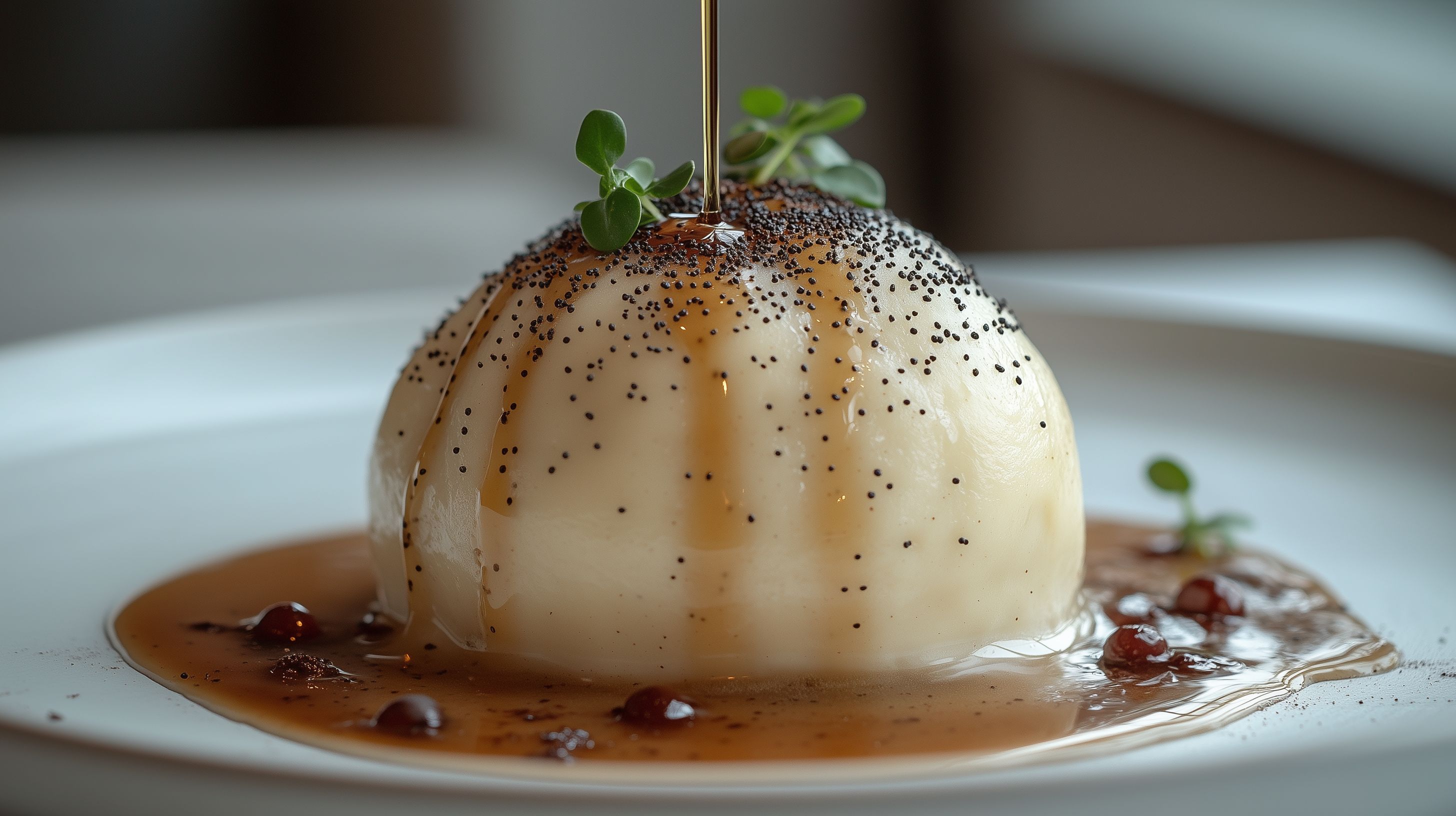 Dieses verlockende Foto zeigt einen frisch zubereiteten Germknödel, der mit einer Kruste aus knusprigen Mohnkörnern überzogen ist und in einer eleganten Vanillesoße schwimmt. Der Knödel hat eine leicht glänzende, transparente Oberfläche, die den Appetit anregt. Die rustikale Tischszenerie mit den grünen Akzenten verleiht dem Gericht eine natürliche, sinnliche Ausstrahlung.