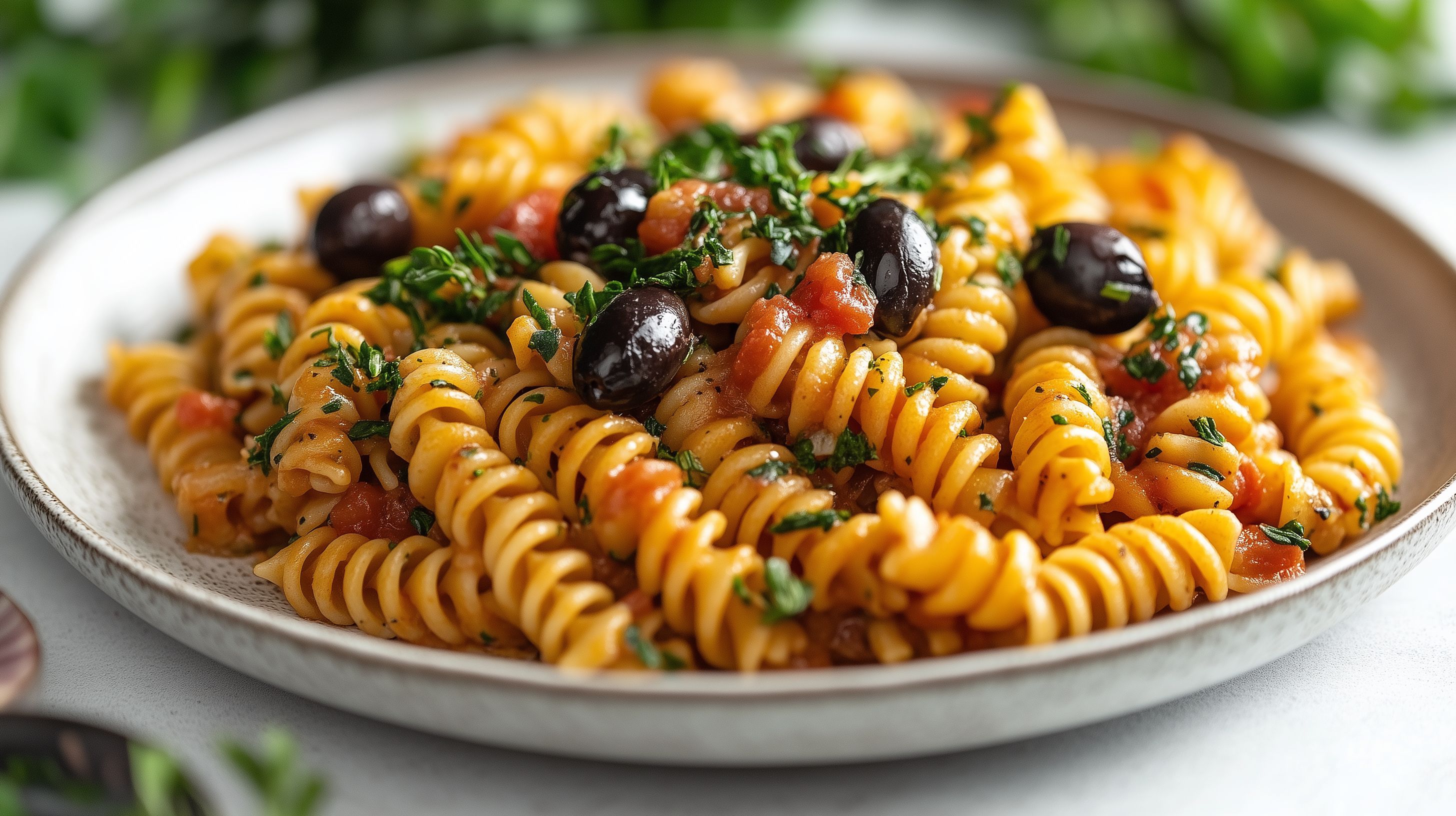 Dieses köstliche Gericht zeigt einen teller mit fusilli provençale, einer typischen italienischen Pastaspezialität. Die gelblichen Nudeln sind mit einer Tomatensauce, schwarzen Oliven und frisch gehackter Petersilie angerichtet, was dem Salat ein appetitliches, mediterranes Flair verleiht. Die Zutaten fügen sich zu einem farbenfrohen und knackigen Gesamtbild zusammen, das zum Genießen einlädt. Dieses hochwertige Stockfoto in hoher Auflösung kann für verschiedenste Zwecke wie Blogs, Social-Media-Posts oder Werbematerial kostenlos und unter Creative-Commons-Lizenz genutzt werden.