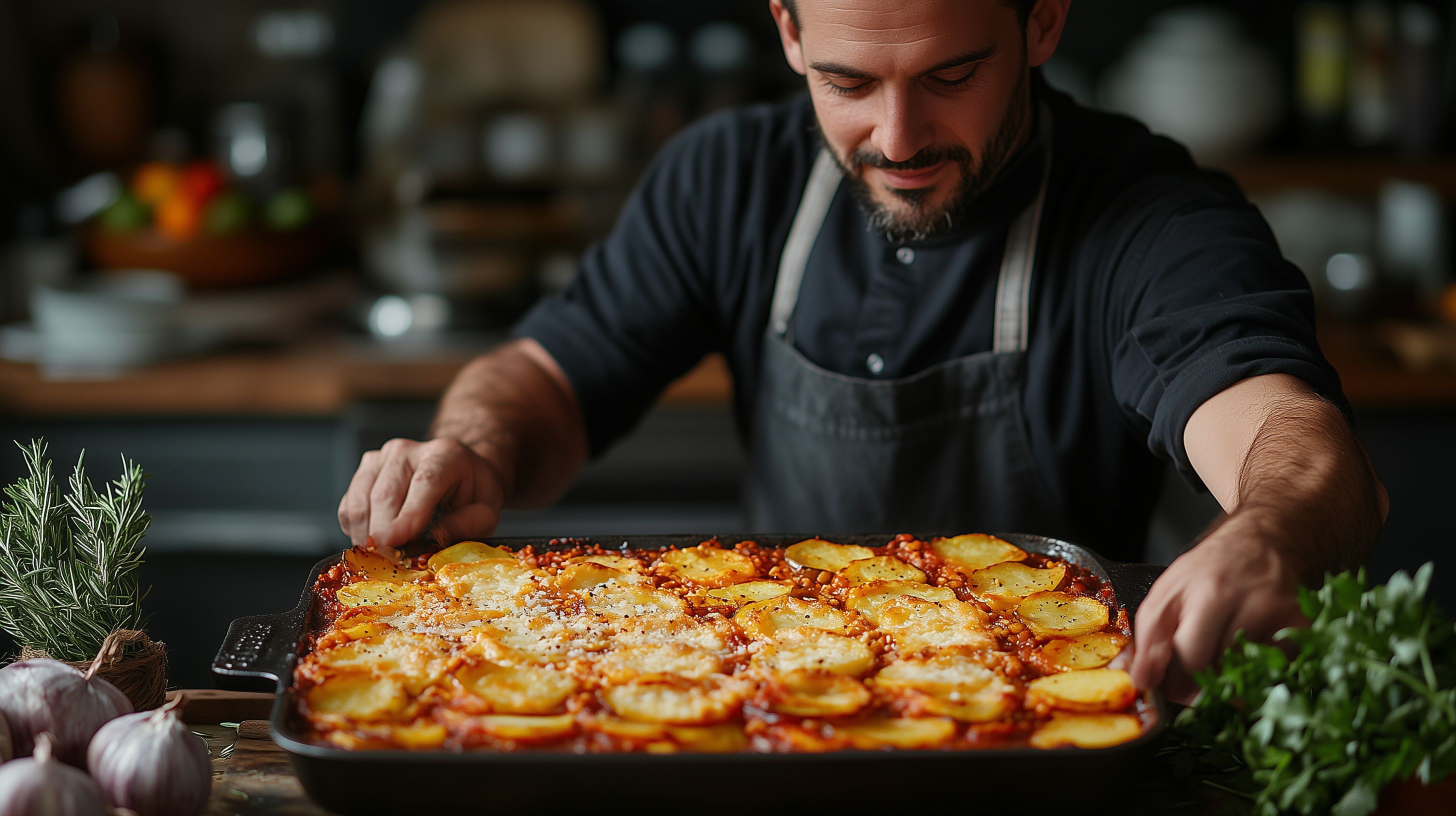 Das Bild zeigt einen Mann in einem Küchenschürze, der ein rustikales Moussaka-Gericht zubereitet. Der Mann ist konzentriert dabei, die mit Tomatensauce bedeckten Kartoffelscheiben in einer ofenfesten Form anzuordnen. Im Hintergrund sind weitere Zutaten wie Rosmarin und Knoblauch zu sehen, die vermutlich für das Gericht verwendet werden. Die Atmosphäre wirkt gemütlich und authentisch, was den rustikalen Charakter des Gerichts unterstreicht. Dieses Foto eignet sich hervorragend als kostenloses Stockfoto für Blog-Beiträge, Newsletter, Social-Media-Posts oder Werbematerialien rund um Themen wie Kochen, Backen, mediterrane Küche oder leckere Gerichte. Die hochwertige Auflösung und Creative-Commons-Lizenz ermöglichen eine flexible Nutzung.