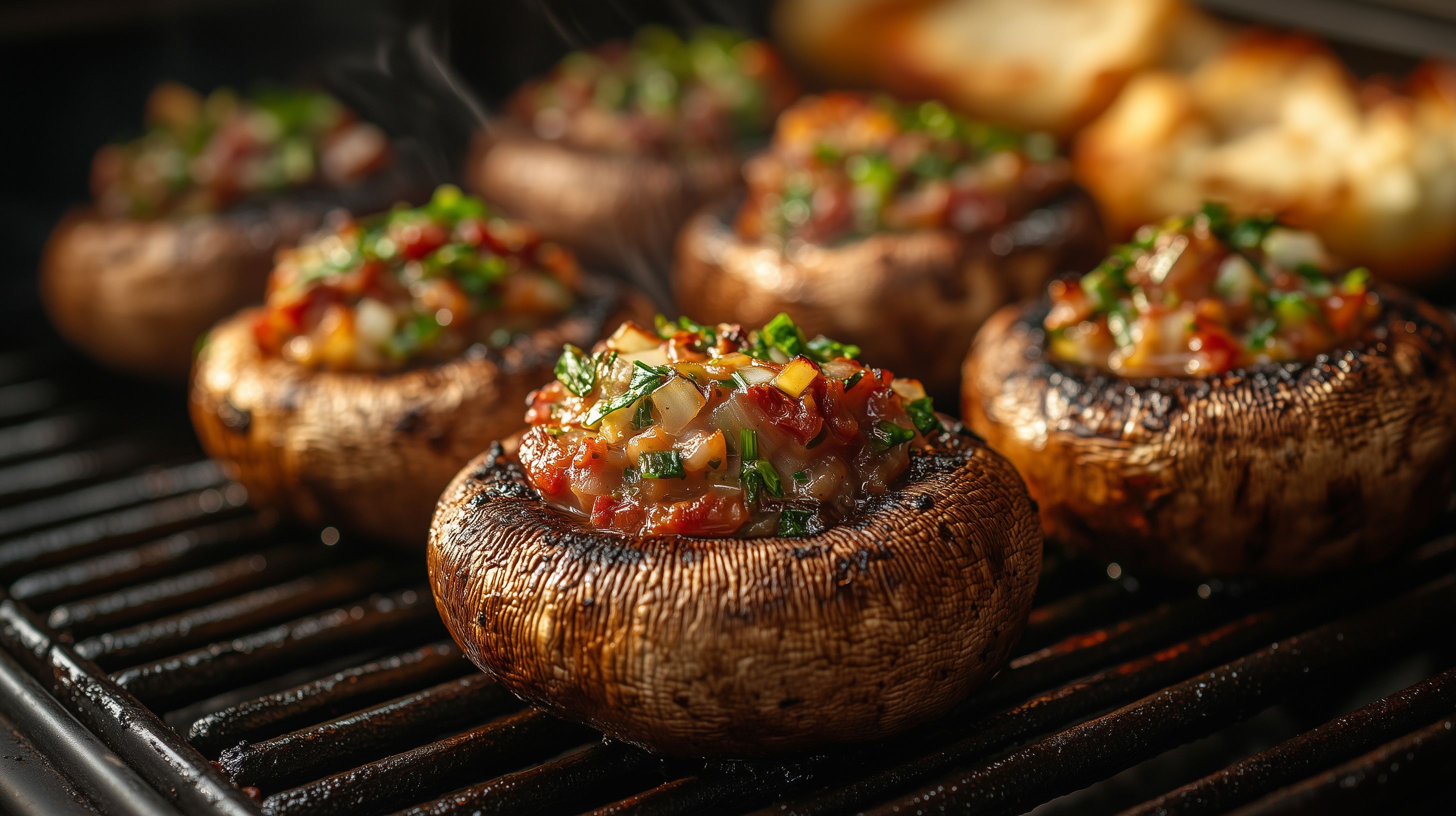 Das Bild zeigt eine Nahaufnahme von gefüllten Champignons, die auf einem Grillrost liegen. Die Pilze sind mit einem würzigen Gemüsetatar gefüllt, das eine schöne Farbkombination aus Rot, Grün und Braun ergibt. Die Oberfläche der Champignons ist leicht gebräunt, was auf eine Zubereitung auf dem Grill hindeutet. Das Bild strahlt eine appetitliche und rustikale Atmosphäre aus und eignet sich hervorragend als kostenloses Stockfoto für Rezeptblog-Beiträge, Menügestaltung oder Werbematerial im Gastronomie- und Lebensmittelbereich. Die hochauflösende Aufnahme in Creative-Commons-Lizenz lässt sich vielseitig einsetzen.