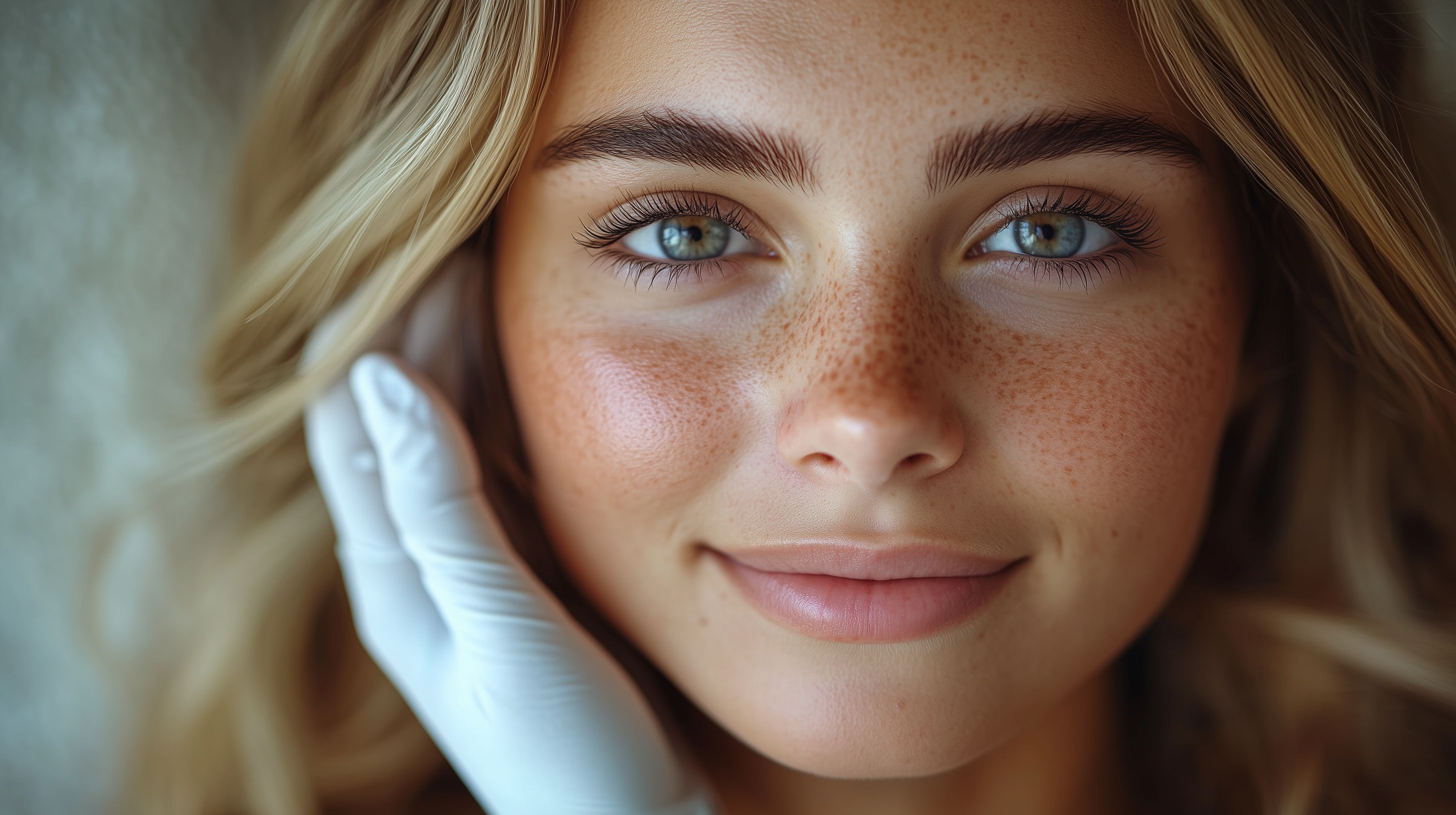 Dieses eindrucksvolle Porträtfoto zeigt das Gesicht einer wunderschönen jungen Frau mit strahlenden blauen Augen, blondem Haar und zarten Sommersprossen. Die Nahaufnahme legt den Fokus auf ihre makellose Haut und betont ihre natürliche Ausstrahlung. Das Bild ist in warmen, weichen Farbtönen gehalten und vermittelt eine friedliche, entspannte Stimmung. Es eignet sich hervorragend als Hintergrundbild für Websites, Newsletter oder Social-Media-Posts zum Thema Schönheit, Wellness oder Mode. Dieses hochwertige Stockfoto ist in hoher Auflösung und unter einer Creative-Commons-Lizenz verfügbar.
