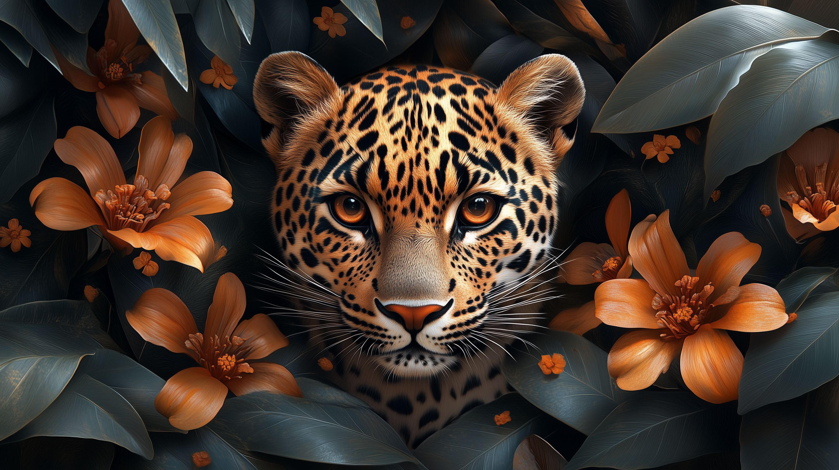 Dieses faszinierende Foto zeigt eine detaillierte Nahaufnahme des Gesichts eines Leoparden, der durch ein Blätterwerk aus tropischen Blumen und Blättern blickt. Der Kontrast zwischen den intensiven orangefarbenen Blüten und dem markanten Muster des Leopardenfells ist beeindruckend. Die Schärfe und Klarheit des Bildes lassen die Augen des Raubtieres lebendig und fesselnd erscheinen. Dieses kostenlose Stockfoto in hoher Auflösung eignet sich hervorragend für den Einsatz in Blogs, Newslettern, auf Social-Media-Kanälen oder für Werbezwecke unter einer Creative-Commons-Lizenz.