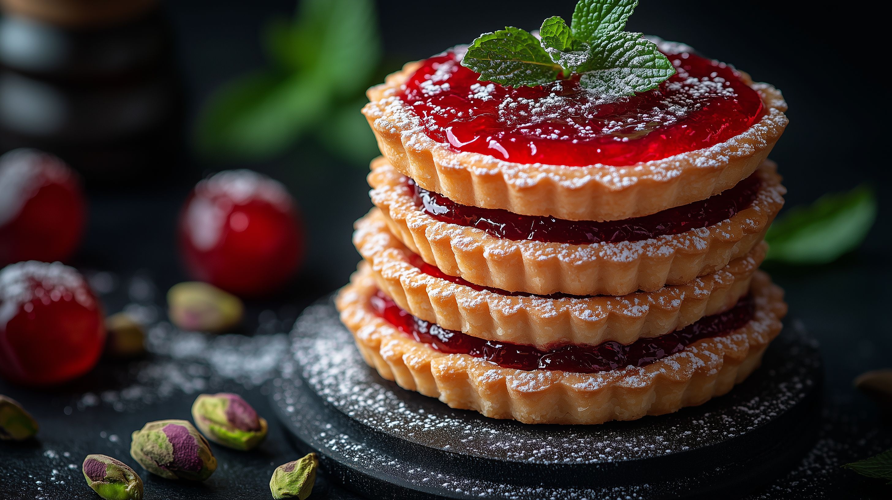 Dieses Foto zeigt eine gestapelte Anordnung von kleinen, dekorativen Törtchen. Die Törtchen haben eine knusprige, goldbraune Kruste und sind mit einer leuchtend roten Fruchtgeleeschicht und frischen Minzblättern garniert. Der dunkle Hintergrund lässt die Farben und Details der Törtchen klar hervortreten. Diese hochaufgelösten Stockfotos eignen sich perfekt für die Verwendung in Blogs, Newslettern, Werbung oder Social-Media-Posts, bei denen ansprechende, appetitliche Lebensmitteldarstellungen gefragt sind. Die Törtchen sind in einem natürlichen, kreativen Stil präsentiert und unter einer Creative-Commons-Lizenz verfügbar.