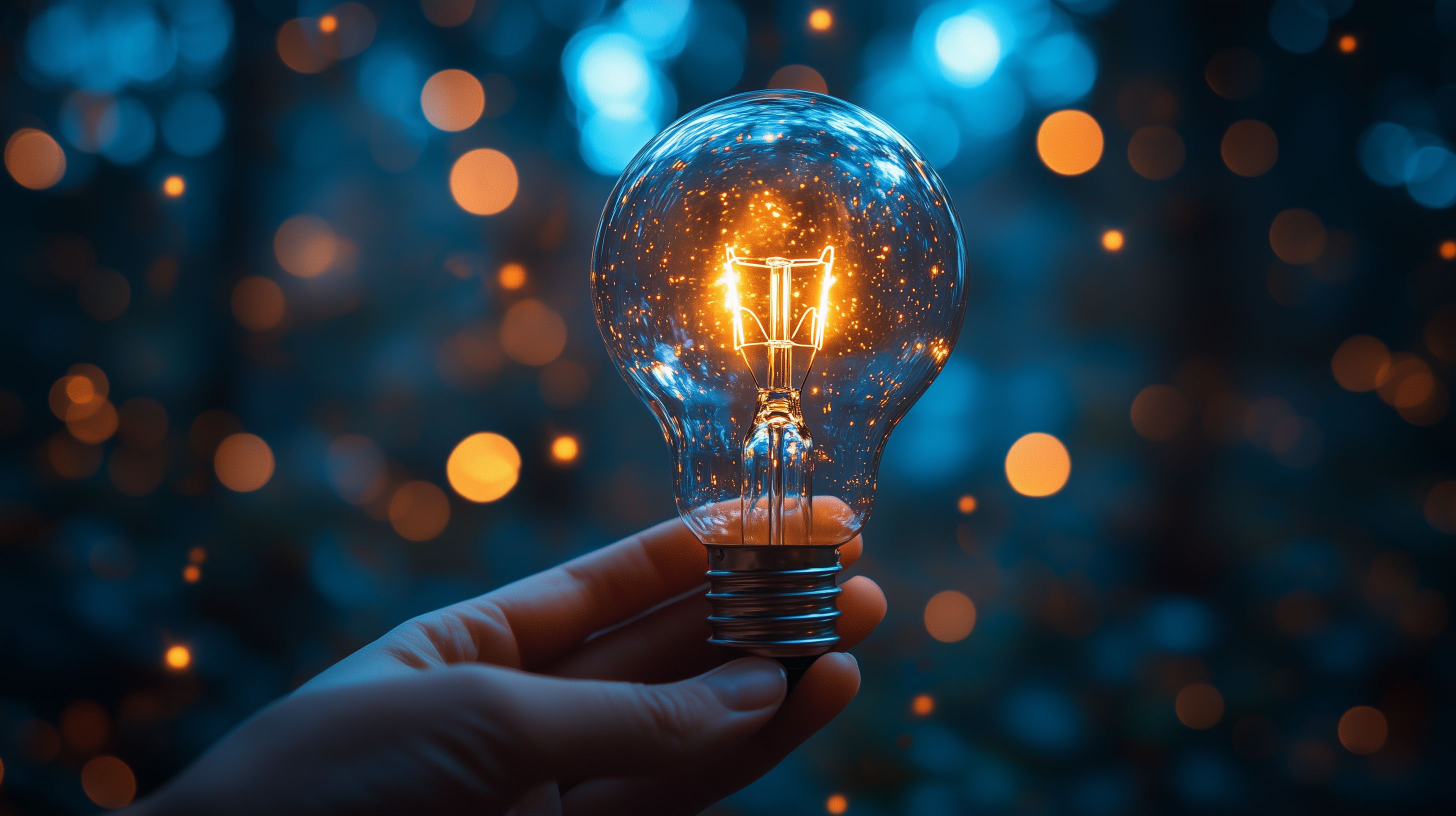 Dieses Foto zeigt eine leuchtende Glühbirne, die von einer Hand gehalten wird. Die Glühbirne ist von einem blauen und orangen Bokeh-Effekt umgeben, der eine stimmungsvolle, kreative Atmosphäre schafft. Das Bild vermittelt den Eindruck von Energie, Ideen und Inspiration. Es eignet sich hervorragend als Stockfoto für Blog-Beiträge, Newsletter, Social-Media-Posts oder Werbematerial rund um Themen wie Kreativität, Innovation, Technologie oder Energie. Das Foto ist in hoher Auflösung verfügbar und kann unter der Creative-Commons-Lizenz kostenlos verwendet werden.
