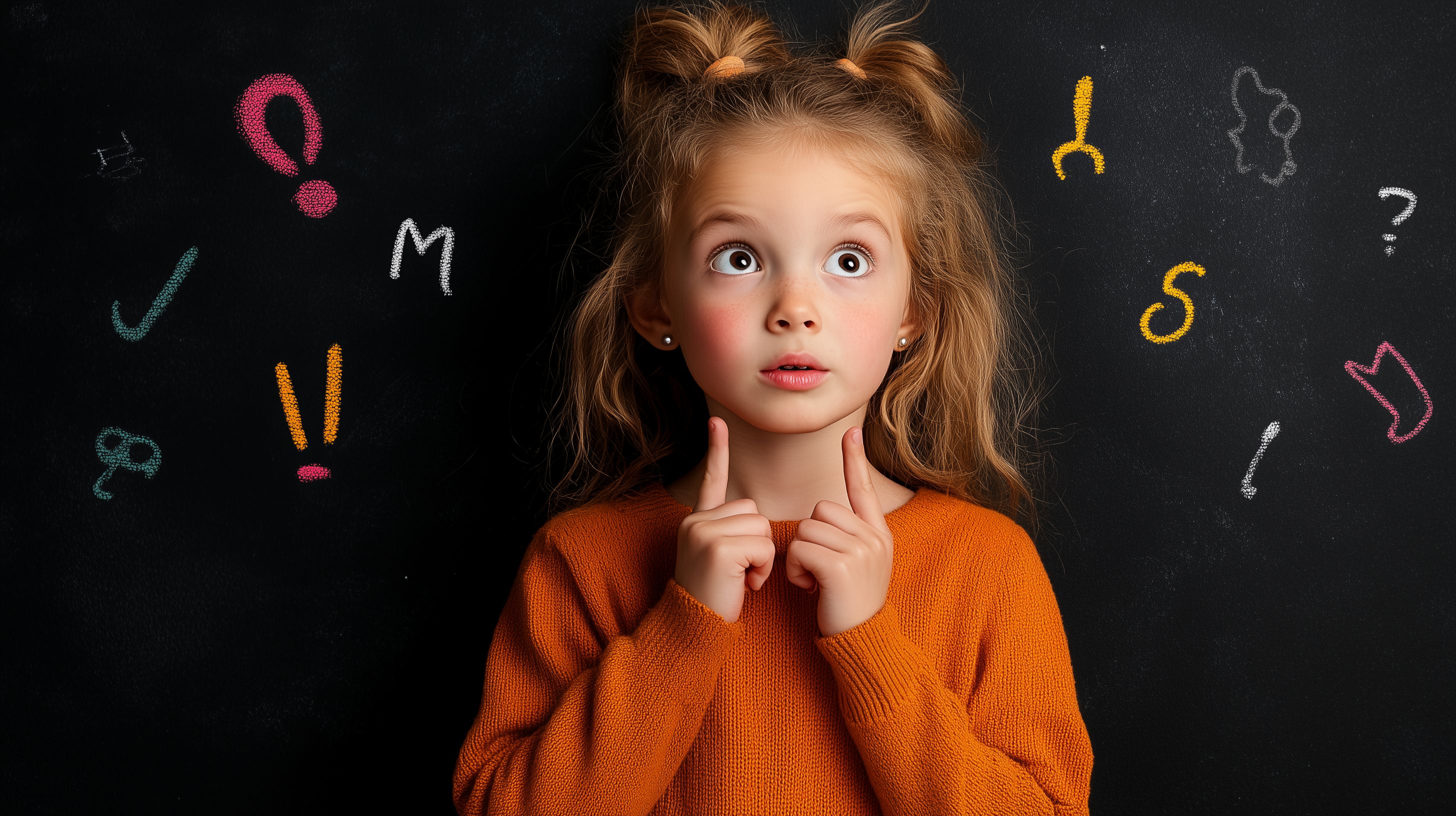 Das Foto zeigt ein nachdenklich wirkendes Mädchen mit zerzausten, rotbraunen Haaren vor einer dunklen Kreidetafel mit bunten Kritzeleien. Das Mädchen trägt einen orangefarbenen Pullover und blickt mit großen, verträumten Augen in die Kamera. Die Komposition lenkt den Blick direkt auf das Gesicht des Kindes, das durch die helle Beleuchtung von vorne hervorgehoben wird. Dieses hochwertige Stockfoto eignet sich hervorragend für den Einsatz in Blogbeiträgen, Newslettern, Social-Media-Kanälen oder Werbematerialien, die sich mit Themen wie Kreativität, Lernen oder Kindheit befassen. Es ist in hoher Auflösung verfügbar und kann unter der Creative-Commons-Lizenz kostenfrei verwendet werden.