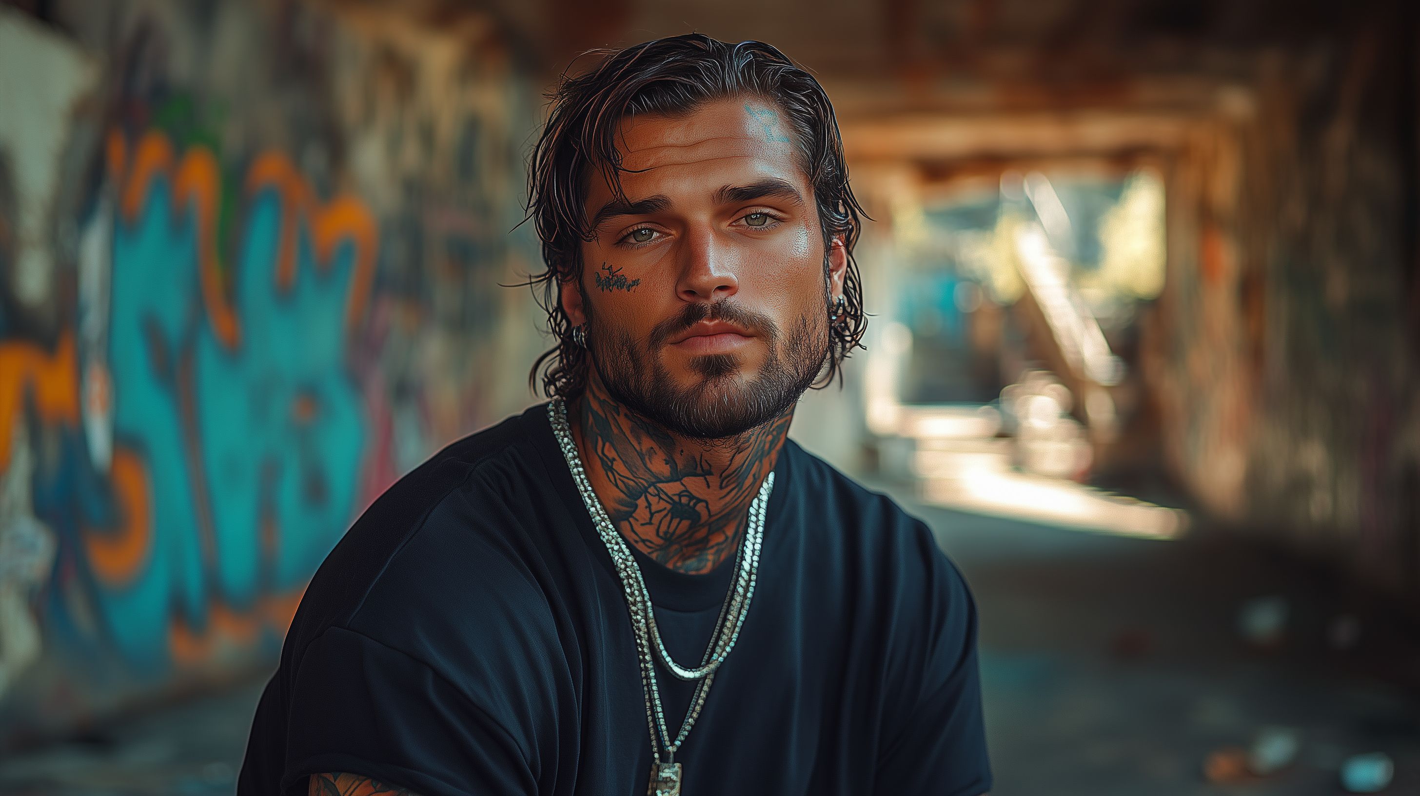 Das Bild zeigt einen tätowierten Mann mit Kapuze und markanten Gesichtszügen, der vor einer bunten Graffitiwand posiert. Der Fokus liegt auf dem intensiven Blick und der rebellischen Ausstrahlung des Models. Die dunkle Farbgebung und die Kombination aus modernem Streetwear-Outfit und industrieller Umgebung verleihen dem Bild einen urbanen, zeitgemäßen Charakter. Dieses hochauflösende Stockfoto eignet sich hervorragend für Publikationen in Bereichen wie Lifestyle, Mode, Social Media oder Werbekampagnen, die eine jugendliche, authentische Ästhetik transportieren möchten. Das Bild steht unter einer Creative-Commons-Lizenz zur freien Nutzung zur Verfügung.
