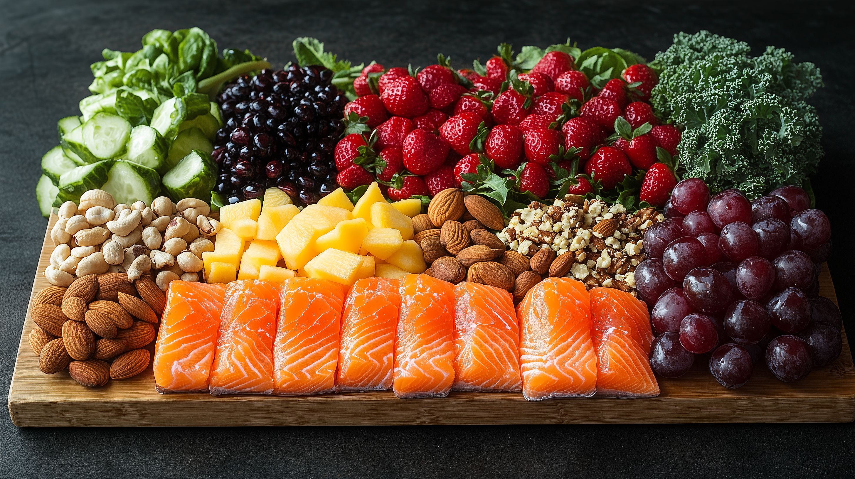 Dieses Foto zeigt eine bunte Auswahl an gesunden, frischen Lebensmitteln auf einem Holzbrett. Im Vordergrund sind Lachsfilets zu sehen, umgeben von Trauben, Mandeln, Walnüssen, Erdbeeren und anderen Früchten und Gemüsesorten wie Brokkoli und Salatblättern. Die farbenfrohe Zusammenstellung und die rustikale Präsentation auf dem Holz machen dieses Bild zu einem idealen Motiv für Blogs, Newsletter, Social-Media-Posts oder Werbeanzeigen rund um gesunde Ernährung, Rezepte und Foodfotografie. Dieses hochauflösende, kostenlose Stockfoto unter Creative-Commons-Lizenz kann vielseitig eingesetzt werden.