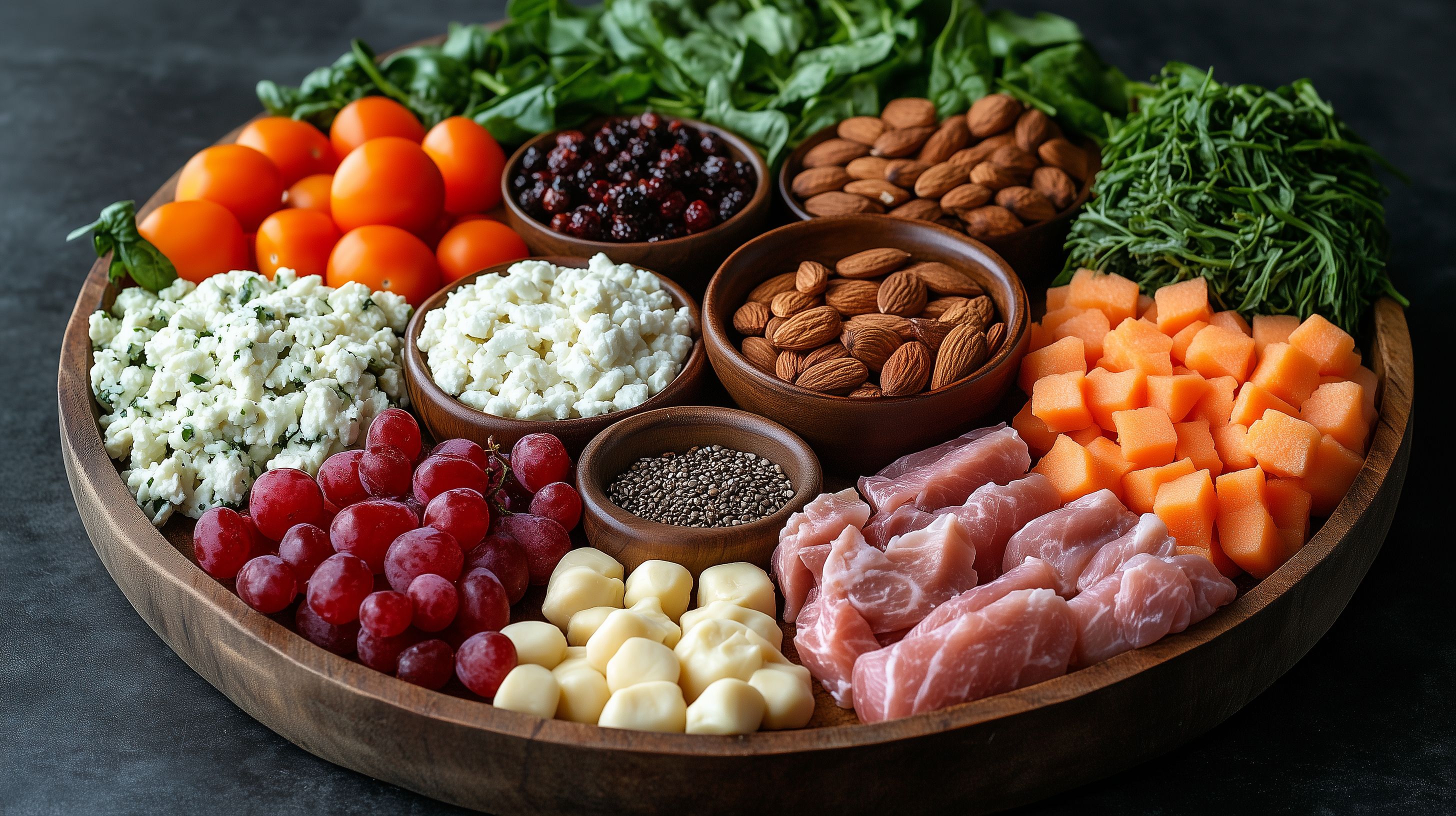 Dieses farbenprächtige Arrangement präsentiert eine Vielfalt an frischen, gesunden Lebensmitteln. Saftiges Obst wie Trauben, Tomaten und Karotten kontrastieren wunderbar mit dunklem Grün von Spinat und Kräutern. Ergänzt wird das Bild durch knackige Nüsse, cremigen Cottage-Käse und zarte Hähnchenstreifen. Die Zutaten sind stilvoll in einer rustikalen Holzschale angeordnet, die eine natürliche, einladende Atmosphäre schafft. Dieses Foto eignet sich perfekt für Rezept-Blogs, Gesundheits-Websites oder Social-Media-Beiträge rund um ausgewogene Ernährung. Als hochauflösendes, kostenloses Stockfoto unter Creative-Commons-Lizenz lässt es sich vielseitig und frei einsetzen.