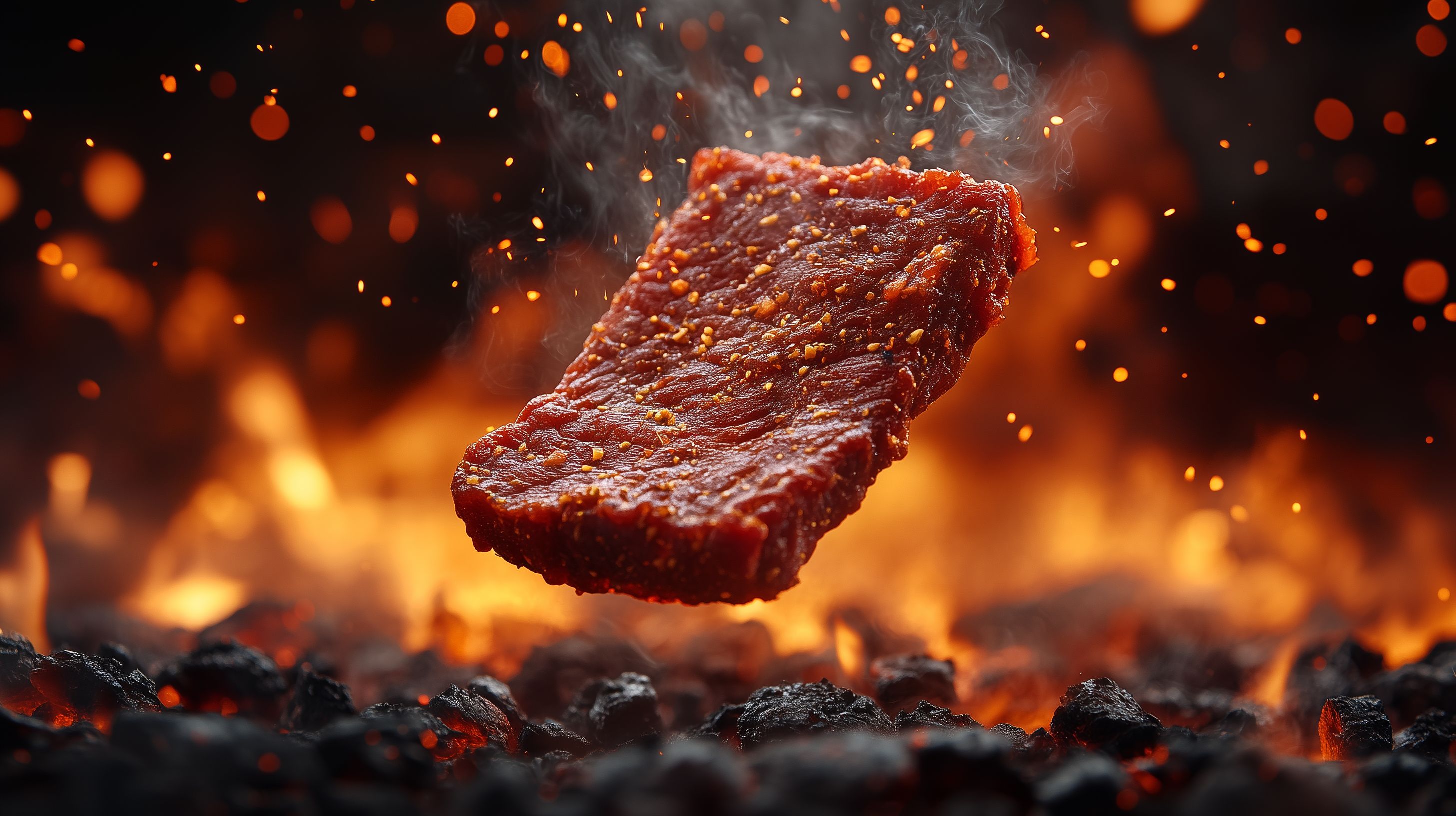Das Foto zeigt ein köstliches, rauchend heißes Grillgut, das über glühenden Holzkohlen zubereitet wird. Die saftigen Fleischstücke sind mit einer würzigen, kräftigen Marinade überzogen, die im Kontrast zu den glühenden Kohlen und dem aufsteigenden Rauch eine intensive, appetitanregende Darstellung schafft. Dieses Stockfoto in hoher Auflösung eignet sich perfekt für die Verwendung in Blogbeiträgen, Newslettern oder Social-Media-Kampagnen rund um das Thema Grillen, Kulinarik und rustikale Küche. Es ist unter einer Creative-Commons-Lizenz frei nutzbar.