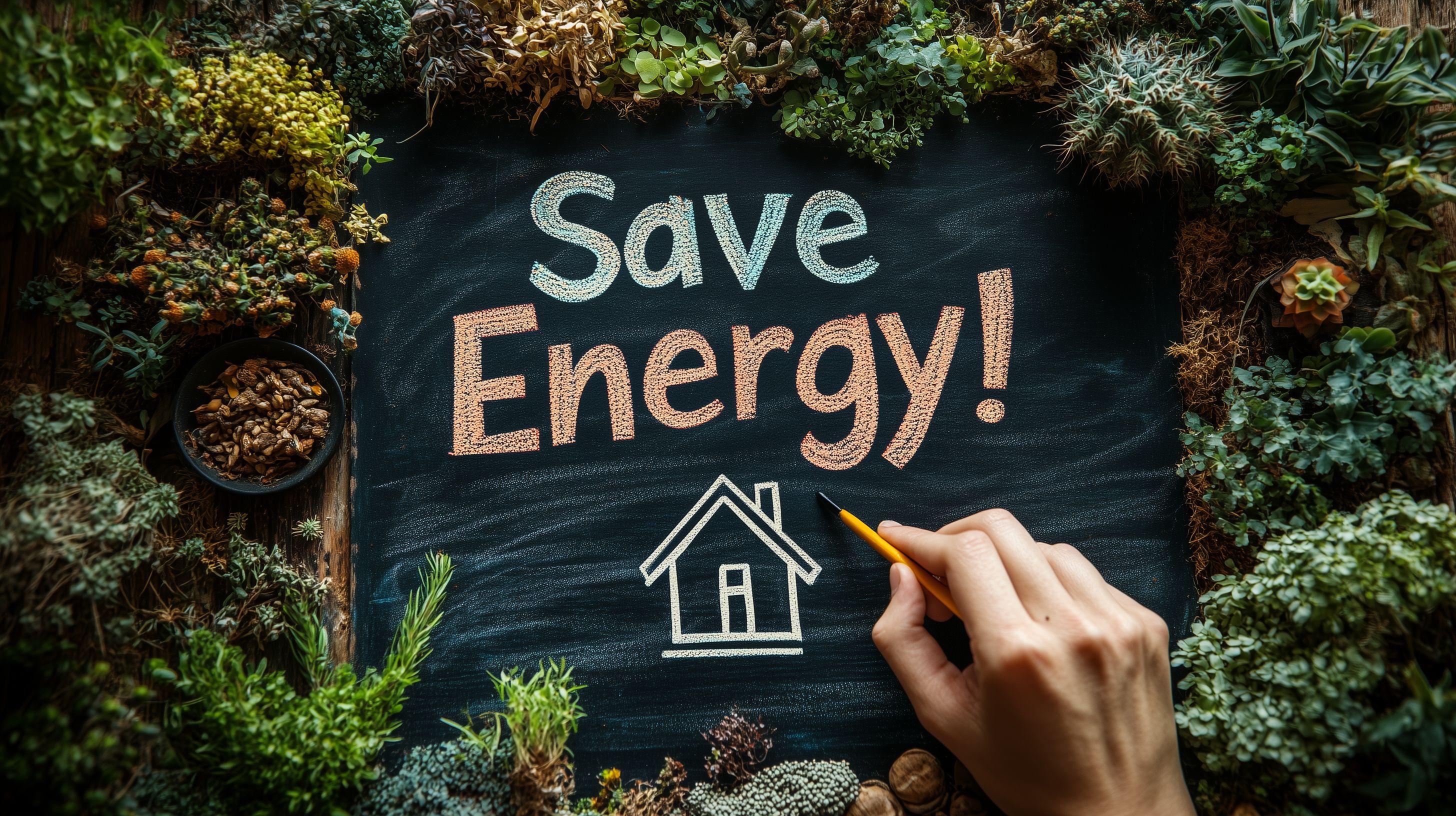 Das Foto zeigt ein kreativ gestaltetes Konzept zum Thema Energiesparen. Auf einer dunklen Holzplatte ist mit weißer Kreide der Schriftzug 'Save Energy!' geschrieben, umgeben von dekorativen Naturmaterialien wie Blättern, Zapfen und Sukkulenten. Die rustikale Komposition vermittelt einen ökologischen und nachhaltigen Ansatz. Dieses Bild eignet sich hervorragend für Beiträge in Blogs, Newsletter oder Social-Media-Kanälen, die sich mit dem Thema Energiesparen und umweltfreundlichem Verhalten im Haushalt beschäftigen. Das hochauflösende, frei nutzbare Stockfoto ist in bester Qualität und unter einer Creative-Commons-Lizenz verfügbar.