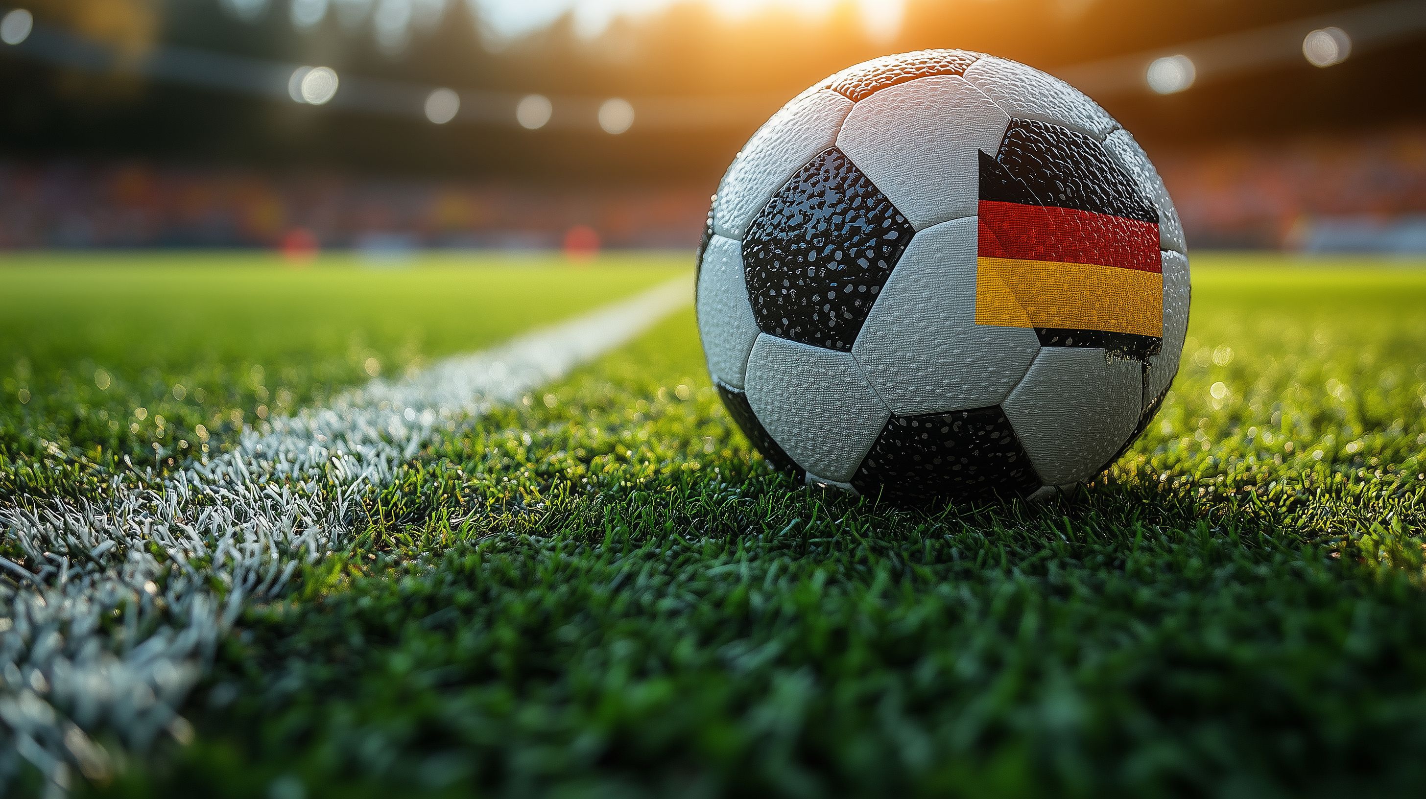 Das Bild zeigt einen Fußball auf einem grünen Spielfeld mit Rasenstreifen. Der Fußball hat eine Deutschlandfahne aufgedruckt und symbolisiert den deutschen Fußballsport. Die Perspektive ist bodennahe und betont den Spielplatz, wodurch ein professioneller, wettkampfbetonter Eindruck entsteht. Dieses Foto eignet sich hervorragend für die Verwendung in Blogs, Newslettern oder Social-Media-Beiträgen rund um den Fußball, das Sportereignis oder die deutsche Nationalmannschaft. Als kostenloses Stockfoto in hoher Auflösung und unter einer Creative-Commons-Lizenz ist es vielseitig einsetzbar.