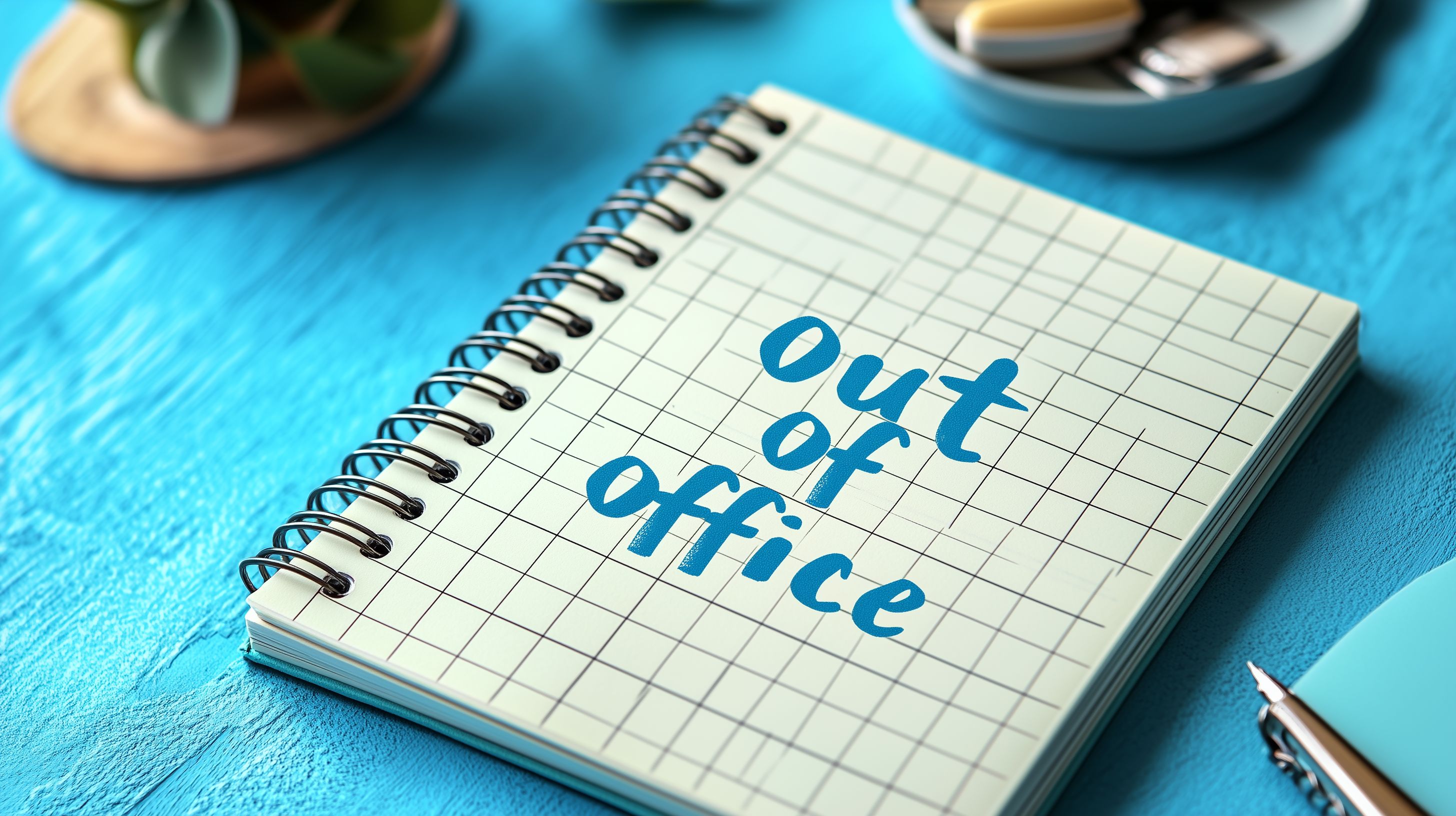 Das Foto zeigt einen Auszeit-Notizblock, der auf einem blauen Holztisch platziert ist. Der Block hat eine klassische, grafische Gestaltung und trägt in blauer Farbe den Text 'Out of Office'. Neben dem Notizblock befinden sich weitere Büroaccessoires wie ein Kugelschreiber, ein grünes Blatt und andere Utensilien, was eine professionelle, aber aufgelockerte Arbeitsatmosphäre vermittelt.