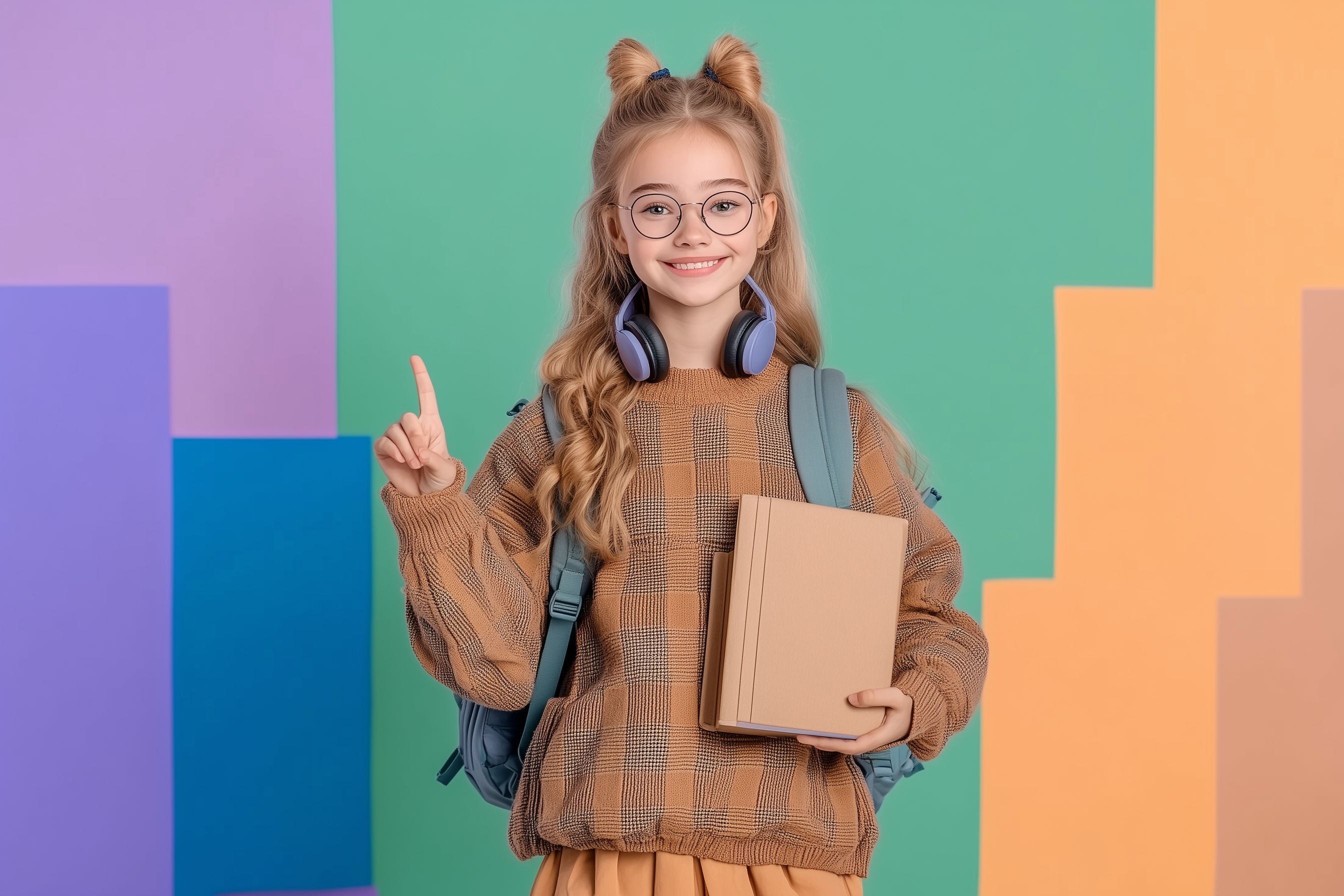 Das Foto zeigt eine junge Schülerin mit Kopfhörern und Büchern, die vor einer bunten, farbenfrohen Wand steht und glücklich in die Kamera lächelt. Sie trägt eine Brille und hat lockiges Haar, das zu zwei Dutten gebunden ist. Die Szene vermittelt einen positiven, entspannten Eindruck und könnte ideal für Bildungsinhalte, Blogbeiträge oder Werbung für Schul- und Lernmaterialien verwendet werden. Das hochauflösende Stockfoto ist unter einer Creative-Commons-Lizenz frei nutzbar.