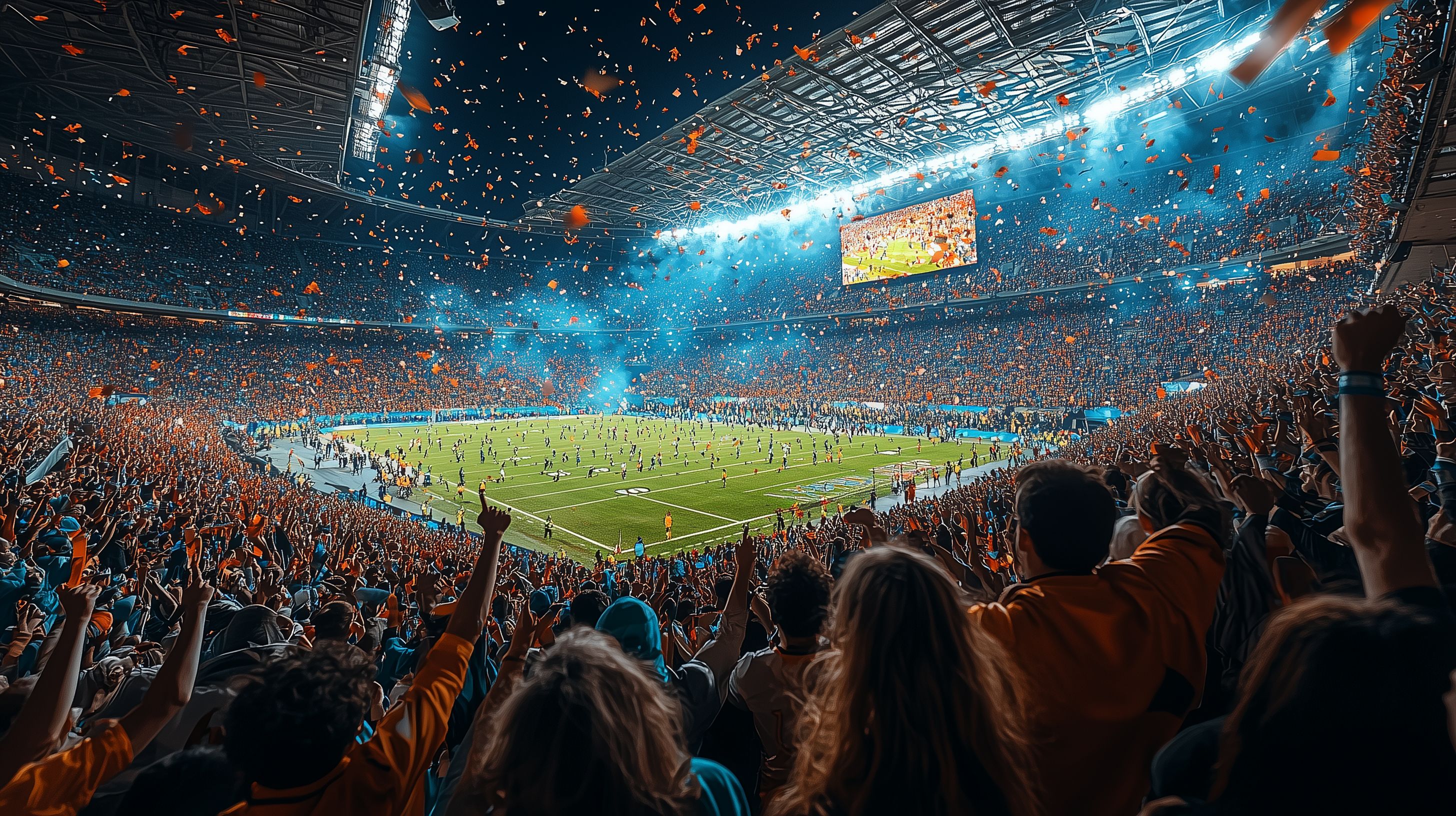 Dieses faszinierende Bild zeigt ein überfülltes Fußballstadion in voller Action. Die Kamera erfasst die Energie und den Enthusiasmus der Fans, die mit erhobenen Armen jubeln und Konfetti in die Luft werfen. Die Perspektive aus der Sicht der Zuschauer verleiht dem Foto eine beeindruckende Dimension, als befände man sich mitten im Geschehen. Das Stadion ist in ein Meer aus Blau, Orange und Licht getaucht, was eine lebendige, emotionale Atmosphäre erzeugt. Dieses kostenlose Stockfoto in hoher Auflösung unter Creative-Commons-Lizenz eignet sich hervorragend für Blogs, Werbekampagnen, Social-Media-Beiträge oder Newslettergestaltung, um Sportbegeisterung und Enthusiasmus zu vermitteln.