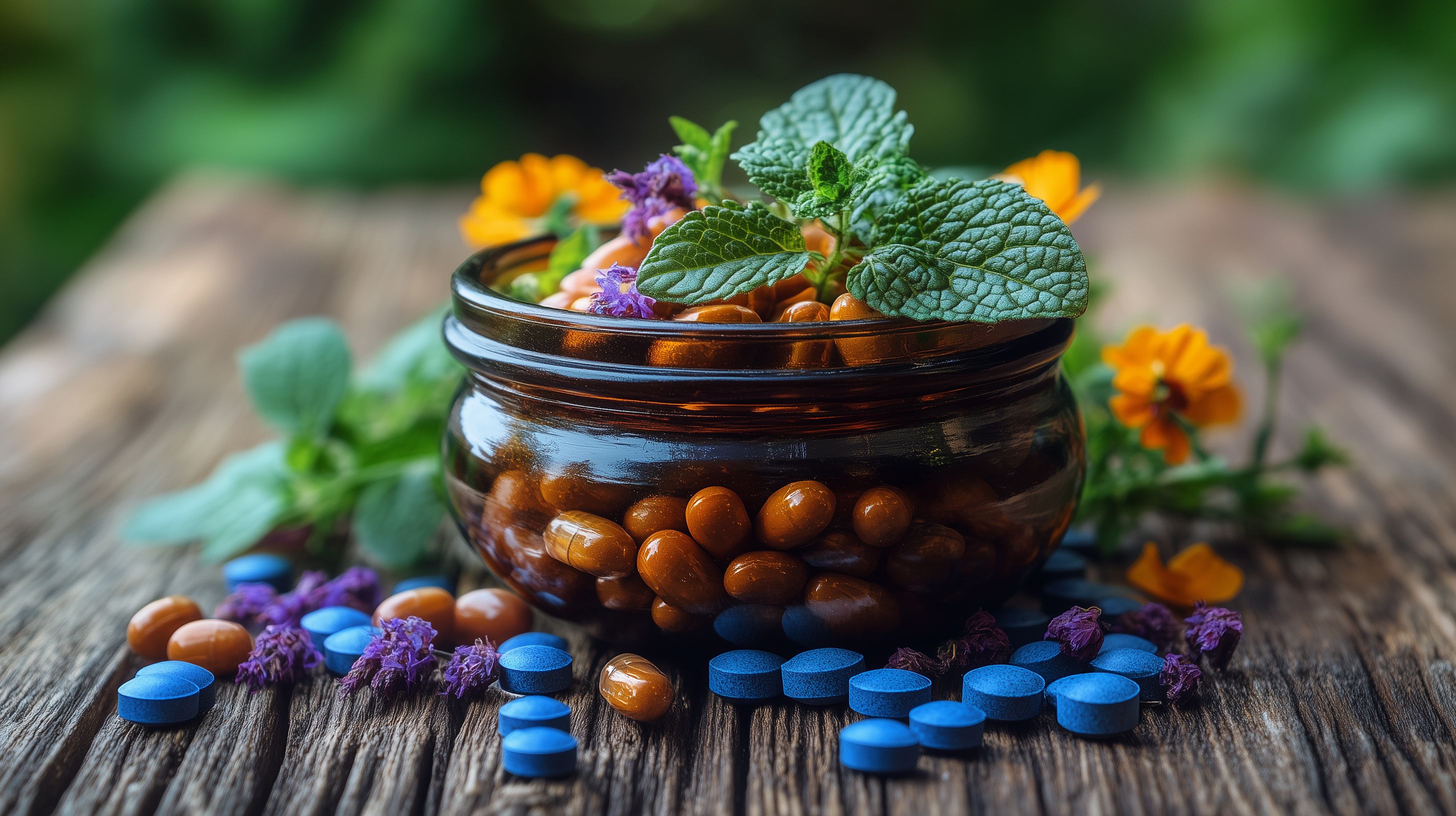 Dieses Foto zeigt eine Glasschale gefüllt mit natürlichen Heilmitteln wie Kräutern, Tabletten und anderen Arzneiformen. Die Schale steht auf einem rustikalen Holztisch, umgeben von frischen Blüten und Blättern. Die Komposition und natürlichen Farben vermitteln einen stimmungsvollen Eindruck von Gesundheit und Wellness. Dieses kostenfreie Stockfoto in hoher Auflösung eignet sich perfekt für Blogs, Newsletter, Social-Media-Beiträge oder Werbung rund um Themen der Naturheilkunde, Alternativmedizin und ganzheitlichen Gesundheit unter einer Creative-Commons-Lizenz.