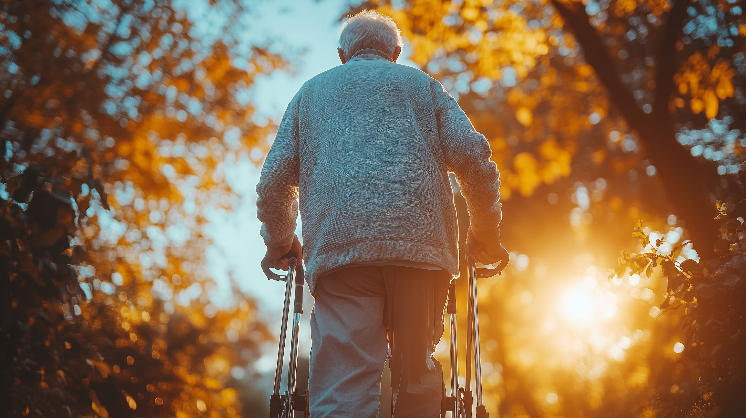 Das Foto zeigt einen älteren Mann, der mit seinem Rollator durch einen herbstlichen Wald spaziert. Im Hintergrund erstrahlt die Sonne durch das bunte Laubwerk, was eine warme, goldene Stimmung schafft. Der Mann ist in einen grauen Pullover gehüllt und genießt sichtlich den Spaziergang inmitten der Natur. Dieses Stockfoto eignet sich perfekt für Blogs, Newsletter oder Social-Media-Posts zum Thema gesundes Altern, Aktivität im Ruhestand oder die Schönheit der Jahreszeiten. Die hochauflösende Datei steht unter einer Creative-Commons-Lizenz zur kostenlosen Nutzung bereit.