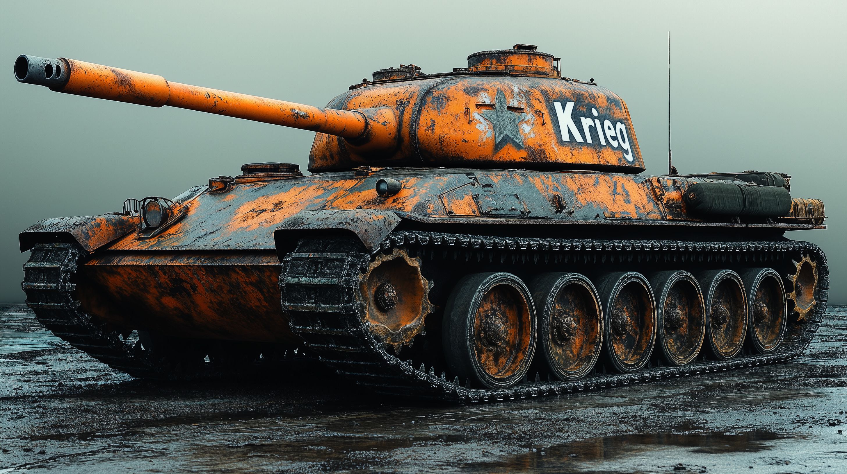 Das Bild zeigt einen schweren, ausgemusterten Panzer in stahlfarbiger und rostroter Camouflage-Lackierung. Der Panzer ist deutlich gealtert und abgenutzt, was den Eindruck von Verfall und Kriegshistorie verstärkt. Auffallend ist die Aufschrift 'Krieg' auf der Frontpanzerung des Fahrzeugs, die den militärischen und kriegerischen Charakter des Motivs unterstreicht.