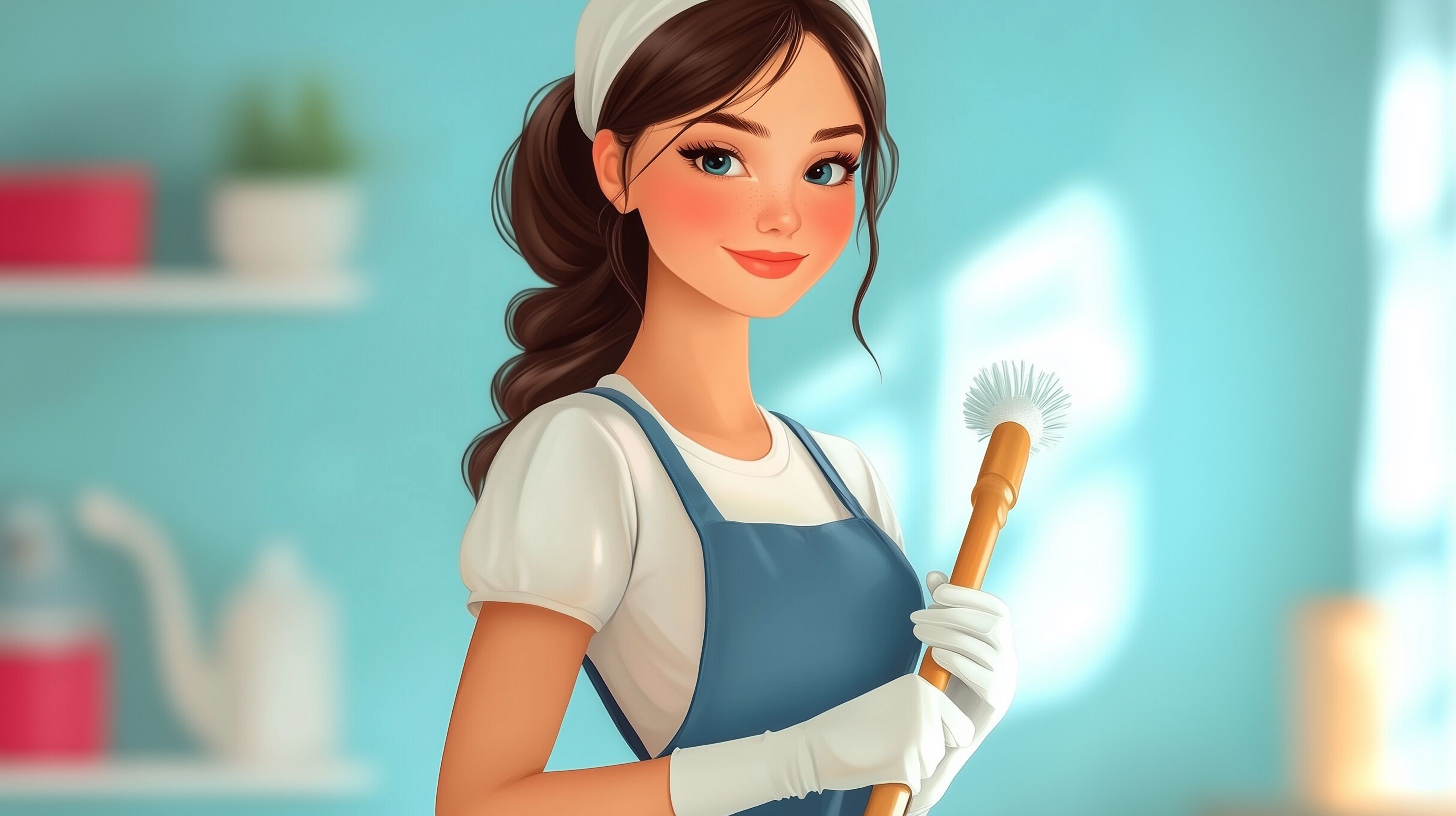 Das Bild zeigt eine stilvolle, lächelnde Reinigungskraft, die eine Bürste in der Hand hält und in einer modernen Küche steht. Mit ihren ansprechenden Farben, der detaillierten Illustration und der einladenden Körpersprache strahlt die Frau Professionalität und Kompetenz aus. Dieses Stockfoto eignet sich hervorragend für die Verwendung in Blogbeiträgen, Newslettern, Social-Media-Kanälen oder Werbekampagnen rund um das Thema Haushaltsreinigung, Putzservice oder die Darstellung von kompetenten, freundlichen Haushaltshilfen. Das hochauflösende Bild steht unter einer Creative-Commons-Lizenz zur kostenlosen Nutzung zur Verfügung.