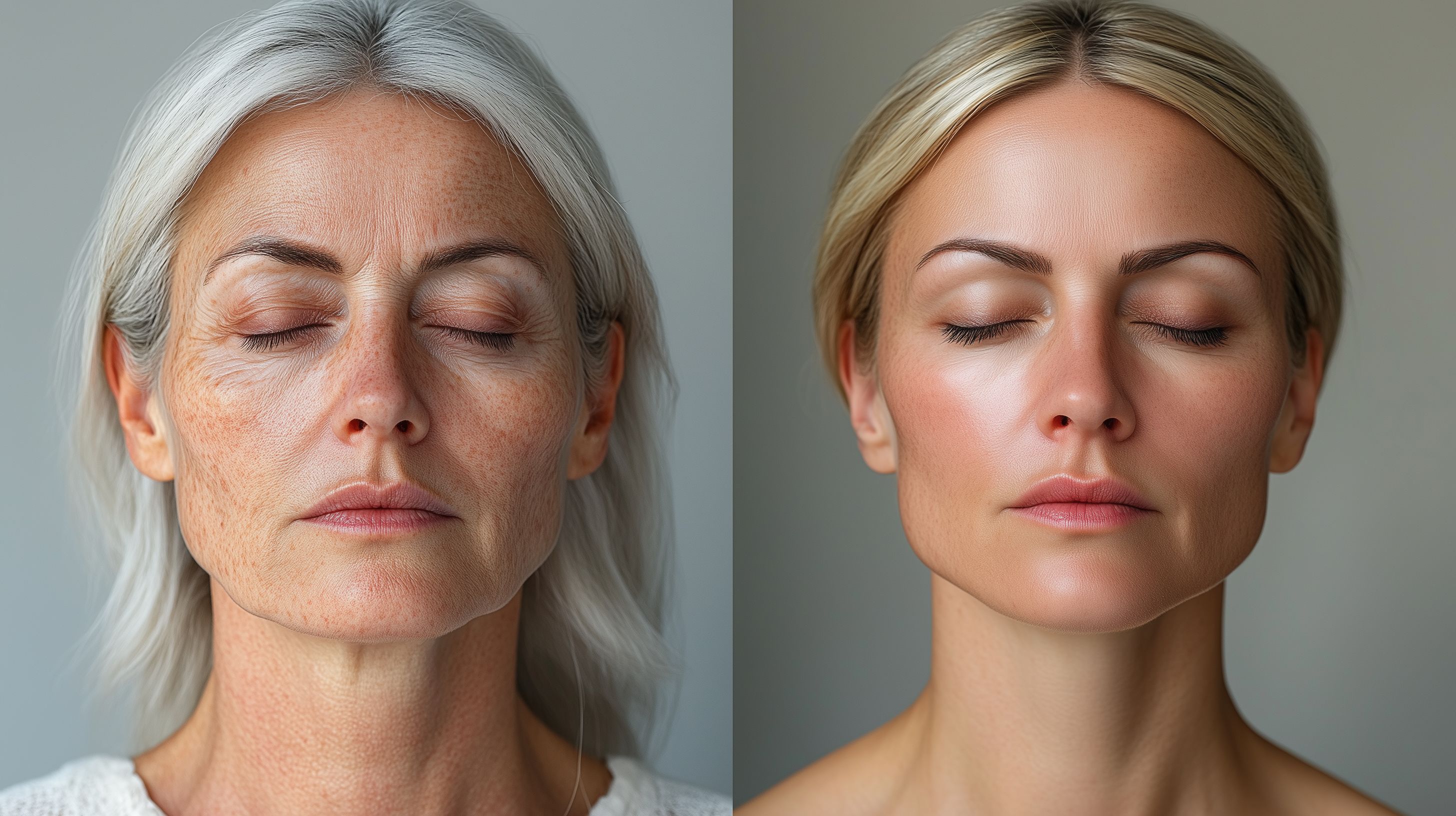 Dieses Foto zeigt den Verjüngungsprozess einer Frau. Die Nahaufnahme des Gesichts verdeutlicht den Unterschied zwischen einer älteren, faltenreichen Haut und einer glatten, jugendlichen Haut. Die geschlossenen Augen und entspannte Gesichtsausdruck lassen den Betrachtenden an eine Schönheitsbehandlung denken. Das Foto eignet sich hervorragend für Beiträge zum Thema Hautpflege, Anti-Aging und Kosmetik in Blogs, Newslettern oder sozialen Medien. Als kostenloses Stockfoto in hoher Auflösung und unter einer Creative-Commons-Lizenz kann es vielfältig genutzt werden.