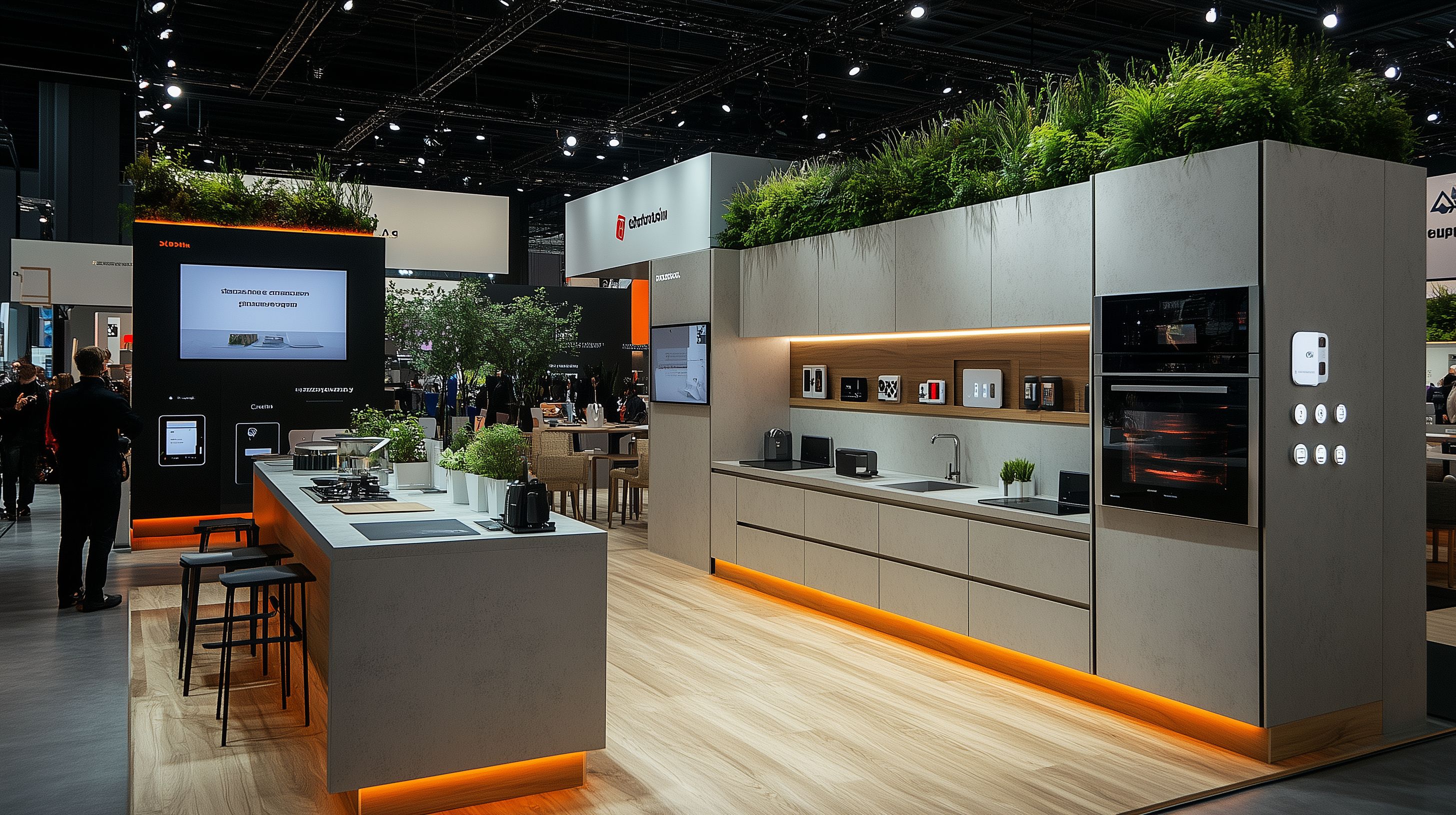 Dieses Bild zeigt einen modernen Messestand mit einer hochwertig gestalteten Küche und smarten Haushaltsgeräten. Der Raum ist großzügig gestaltet und wird durch eine warme Beleuchtung in Szene gesetzt. Grüne Pflanzen und Holzakzente verleihen dem Ambiente eine natürliche Note. Die Küchenelemente in Grau und Orange sind minimalistisch und elegant, während Displays und Touchflächen auf die technischen Möglichkeiten hinweisen. Dieses Foto eignet sich hervorragend als kostenloses Stockfoto für Beiträge rund um neue Küchentrends, smarte Haushaltstechnik oder die Darstellung moderner, nachhaltiger Messestände. Es ist in hoher Auflösung unter der Creative-Commons-Lizenz verfügbar.